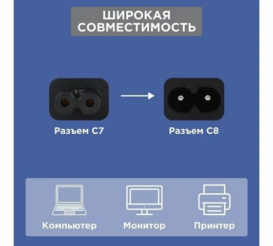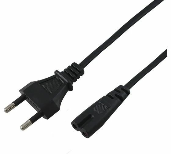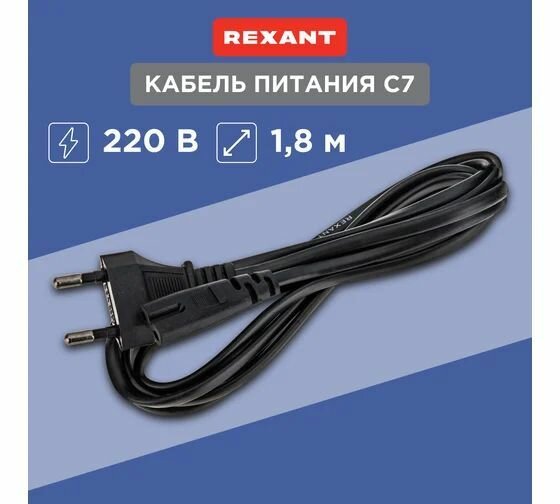 Шнур сетевой REXANT предназначен для подключения к сети переменного тока (AC) с напряжением 220 B аудио- и видеоаппаратуры, источников питания ноутбуков, игровых консолей и других приборов, имеющих штыревой сетевой разъем типа С8 (известен из-за его формы как "восьмерка"). Данный сетевой шнур (IEC cord) оснащен с одной стороны литой неразборной плоской вилкой (евро), с другой - литым гнездовым неполяризованным разъемом типа C7 (евроразъем) и двухжильным проводом.