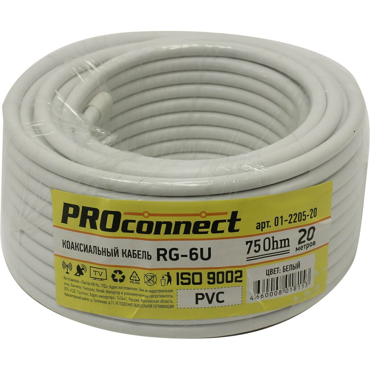 Кабель RG-6U (75 Ом), 48 % белый (бухта 20 м) PROconnect коаксиальный радиочастотный со вспененной полиэтиленовой изоляцией и в ПВХ оболочке. Является самым распространенным решением для подключения внутренних и межблочных соединений общепромышленных и бытовых радиотехнических устройств, для подключения систем телевидения, а также для подключения видеокамер наружного и внутреннего наблюдения.