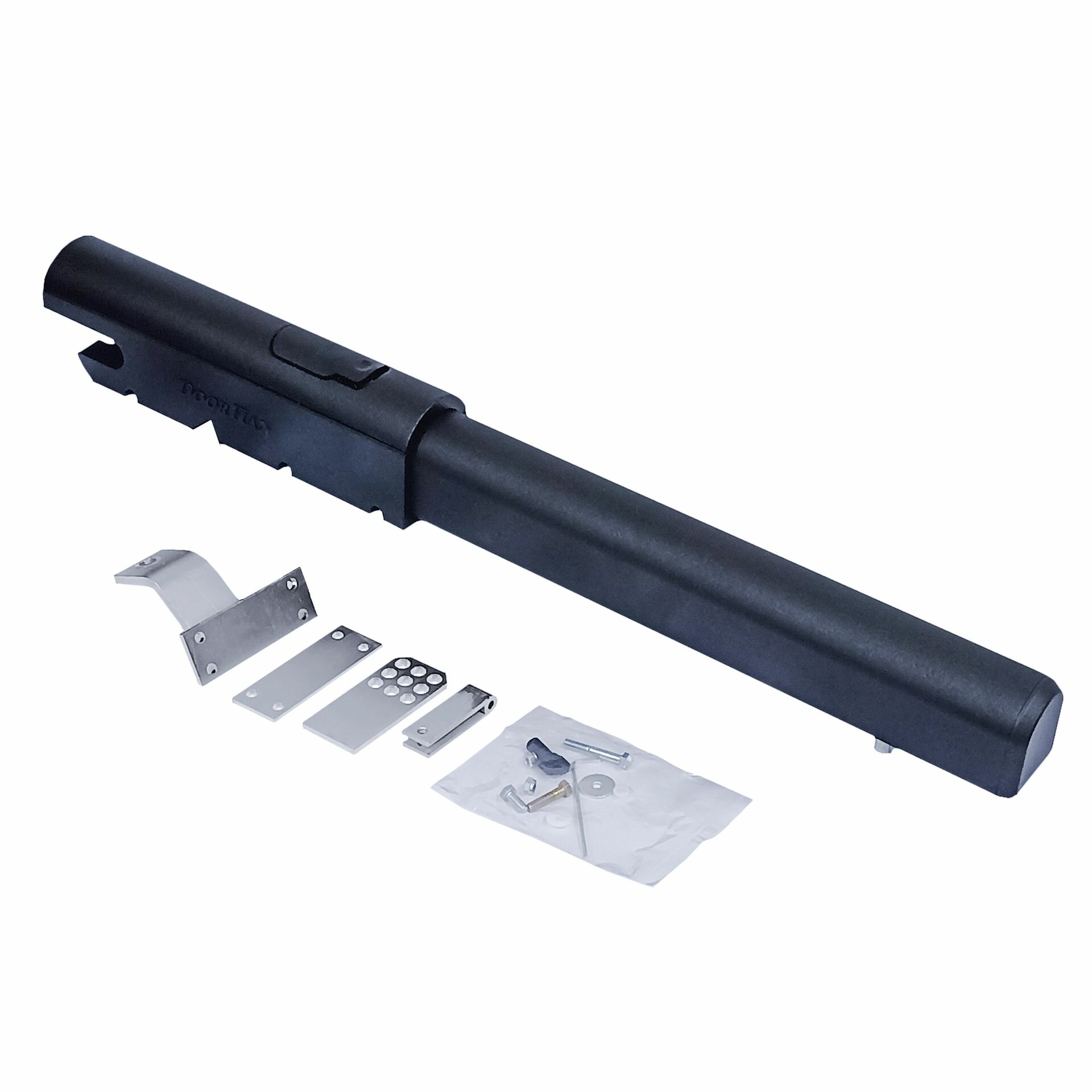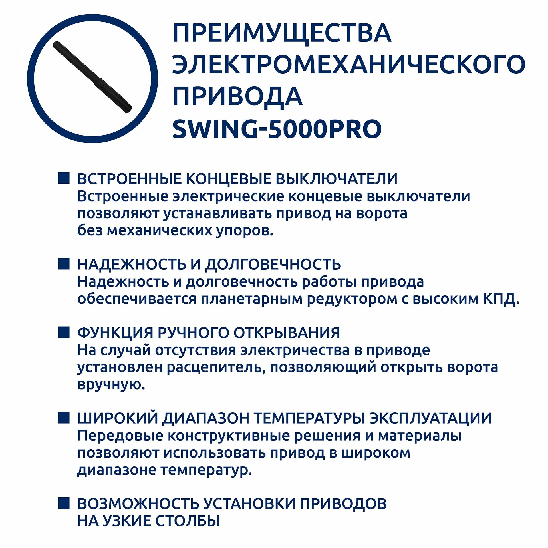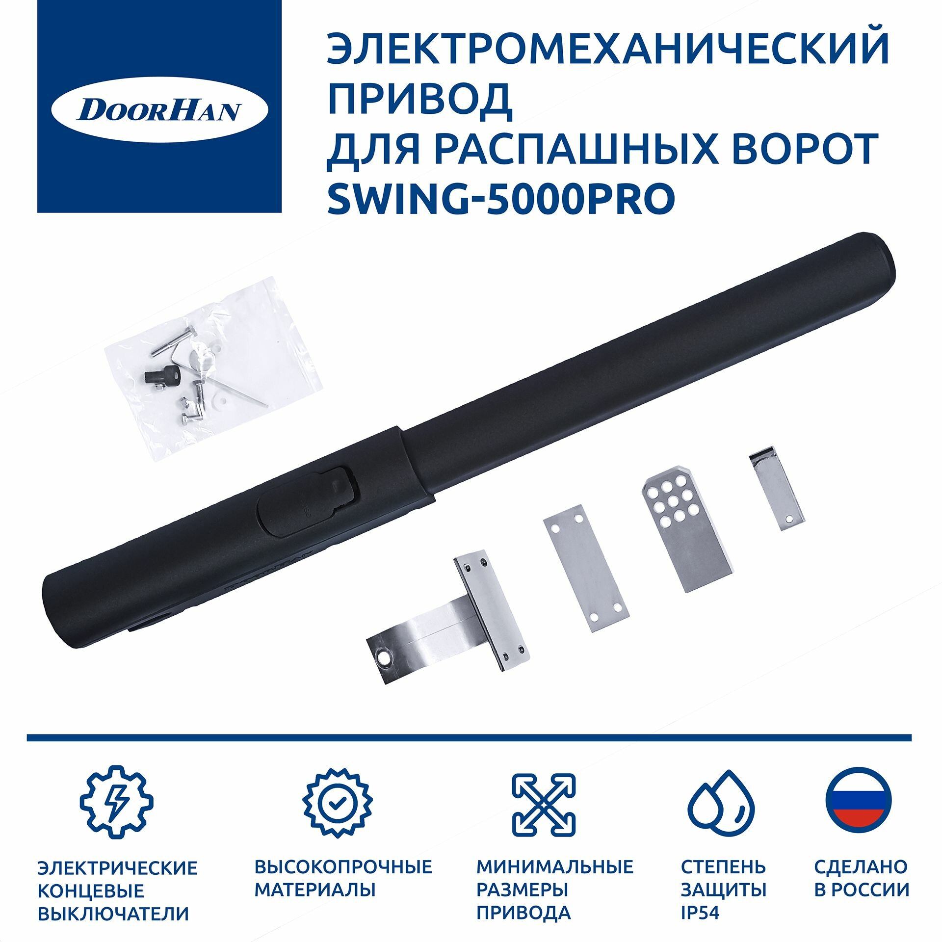 Электромеханический линейный привод производства ГК DOORHAN (Россия) Swing 5000 PRO. Корпус привода выполнен из металла с последующей покраской, стойкой к негативному воздействию окружающей среды. Внутри корпуса расположен электродвигатель, за ним последовательно планетарный редуктор и длинный винт с ходовой гайкой из бронзы. Ходовая гайка (втулка) Swing соединена с вилочным кронштейном, который закреплён на переднем кронштейне ворот. Остановка ворот в крайних положениях производится за счёт встроенной системы концевых выключателей. Ходовой винт выполнен из высококачественной полированной стали для снижения шума и покрыт синтетической низкотемпературной смазкой. Система регулируемых концевых выключателей точно остановит ворота в заданных положениях открытия и закрытия. Привод крепится к распашным воротам в двух точках. Спереди на самой створке, задней частью к воротному столбу. Самоблокирующийся редуктор обеспечивает неподвижность ворот, когда двигатель не работает. При отсутствии питающего напряжения предусмотрена механическая разблокировка электропривода Swing с помощью ручного расцепителя. В этом случае распашные ворота можно открыть и закрыть вручную, а после этого заблокировать привод, обеспечив фиксацию ворот. Линейный электропривод предназначен для распашных ворот массой не более 500 кг и шириной створки не более 5 м. Установка мотора Swing-5000N производится на ворота, которые открываются во внутрь территории. При этом расстояние от створки до внутренней поверхности воротного столба не должно превышать 70-120 мм. Если воротный столб широкий, а створка распашных ворот находится по центру, то установить без обустройства ниши в столбе будет невозможно. Для широких колонн предусмотрена установка электропривода ворот рычажного типа. При открывании распашных ворот наружу устанавливается сразу за створкой, при этом необходимо удлинить пластину заднего кронштейна привода. В блок управления DoorHan SW-mini встроен приёмник радиосигнала для записи пультов радиоуправления. Максимальное количество записанных пультов DoorHan не более 60 шт. Предназначен для распашных ворот средних размеров в частные дома или на промышленные объекты со средней интенсивностью использования.