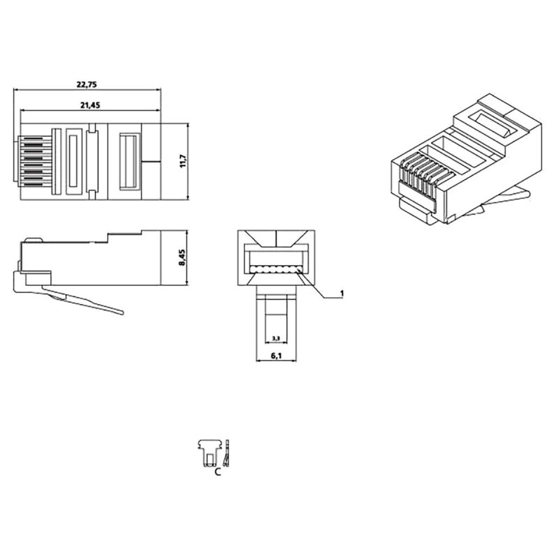 Тип товара: Экранированный универсальный разъем под витую пару для одножильного и многожильного кабеля