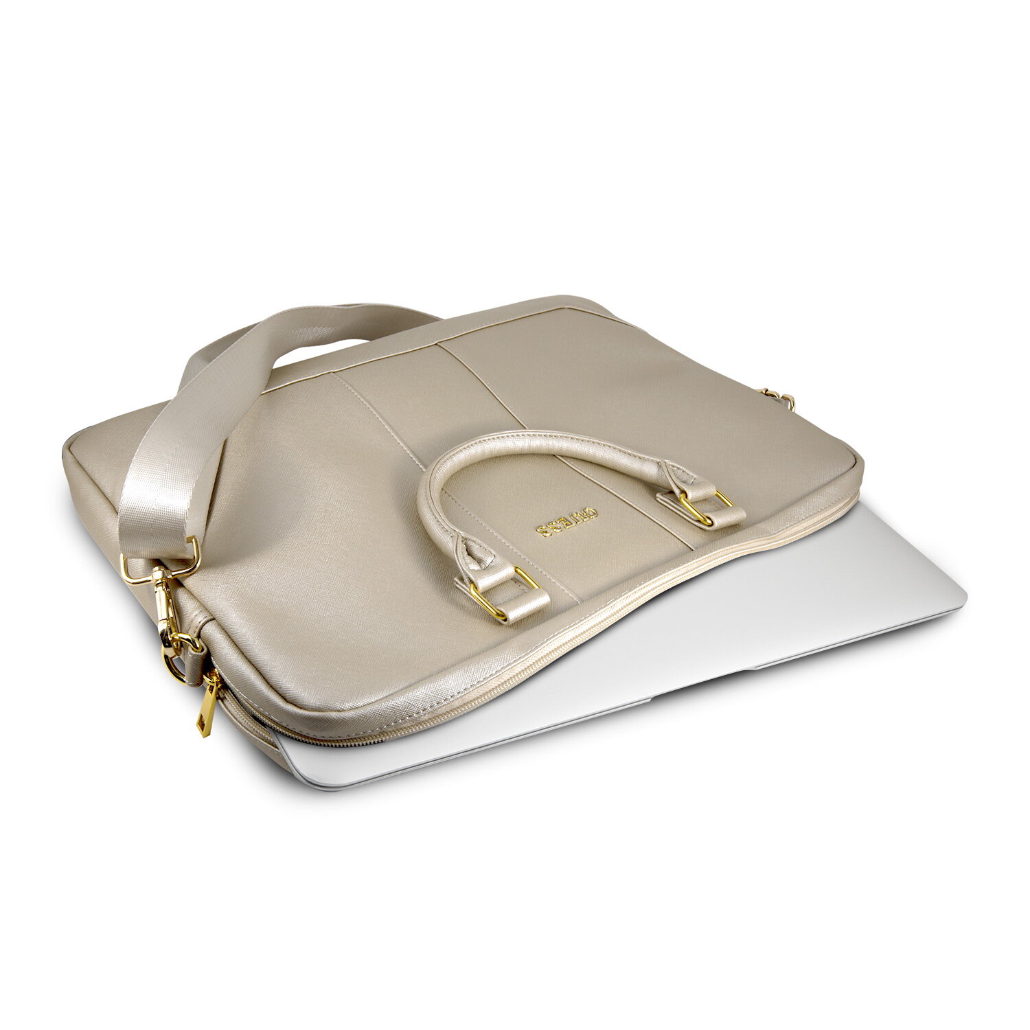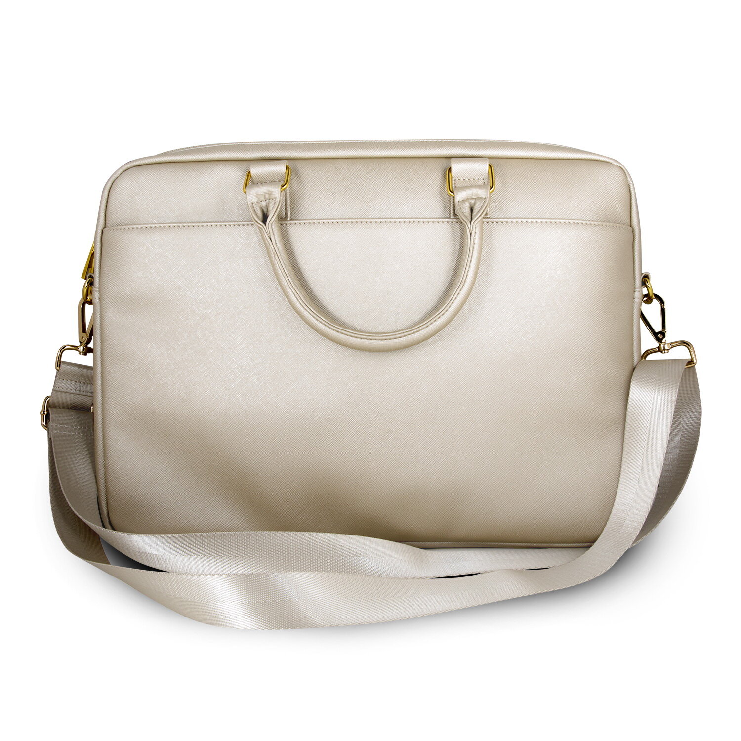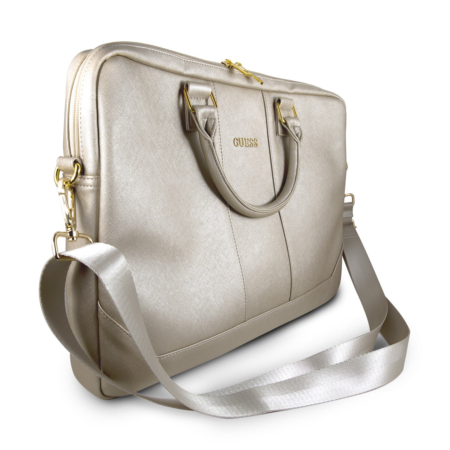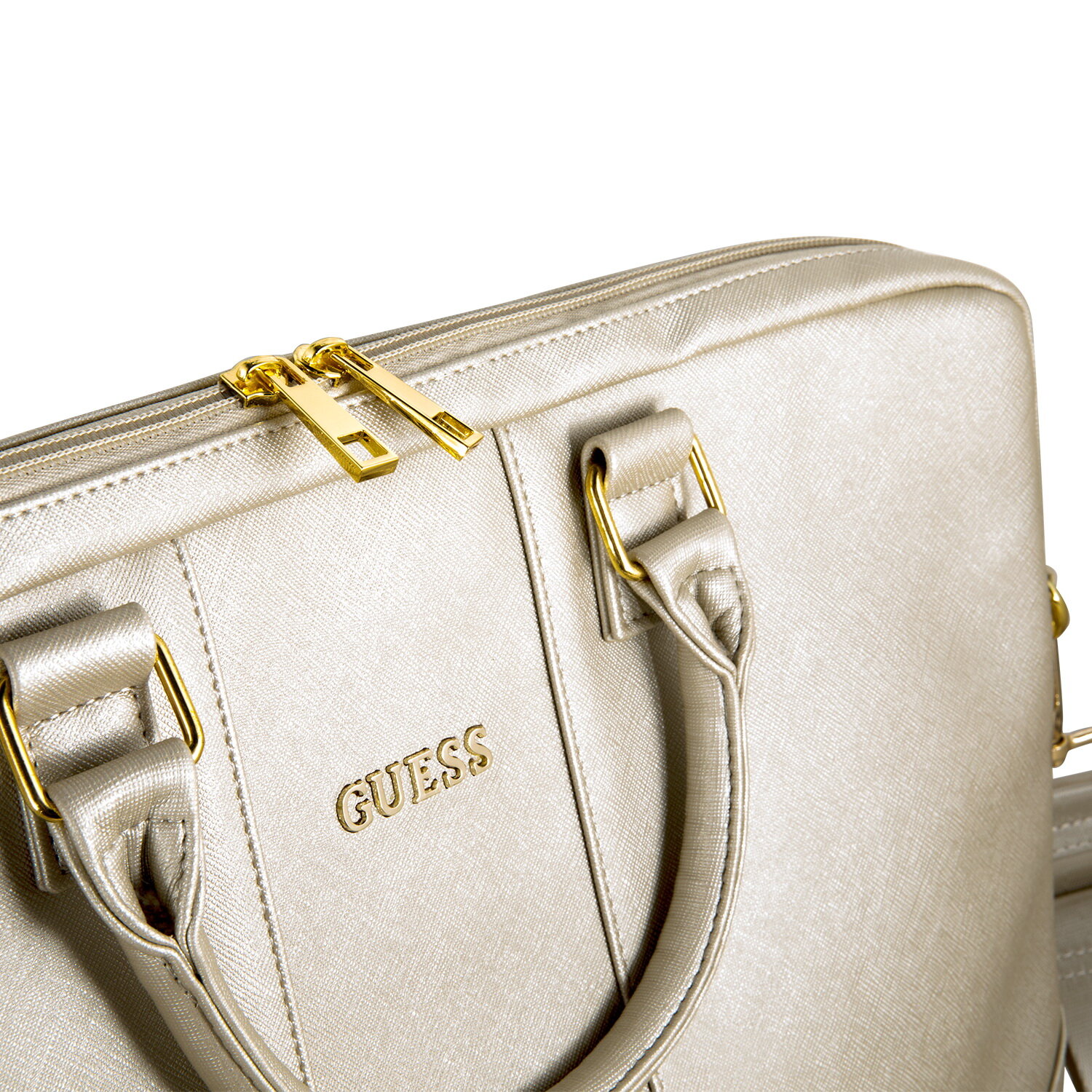 Удобная стильная сумка для ноутбуков до 15 дюймов диагональю Bag с позолоченным логотипом-нашивкой модной компании Guess. Бежевая сумка изготовлена из искусственной кожи "под сафьян". Кейс характеризуется безупречным стилем и элегантностью, благодаря качественной позолоченной фурнитурой и тонкой отделочной строчкой. Продуманная конструкция оригинальной сумки обеспечивает безопасное и удобное размещение предметов разного формата без риска их повреждения. Очень удобное основное отделение имеет два внутренних кармана и закрывается молнией. Так же есть два внешних кармана, которые закрываются потайными магнитными кнопками. Для более удобного использования сумки, можно прикрепить широкий тканевый ремень на карабинах, который регулируемый по ширине. Теперь вы сможете всегда везде брать свой ноутбук с собой, не переживая, за его сохранность.Надежная защита электронного и бумажного содержимого от намокания и загрязнения. Долговечность благодаря сочетанию прочности и износостойкости материала с продуманным кроем и профессиональным пошивом. Универсальность в использовании для ежедневной ходьбы на учебу, работу, поездок в командировку или на отдых.
