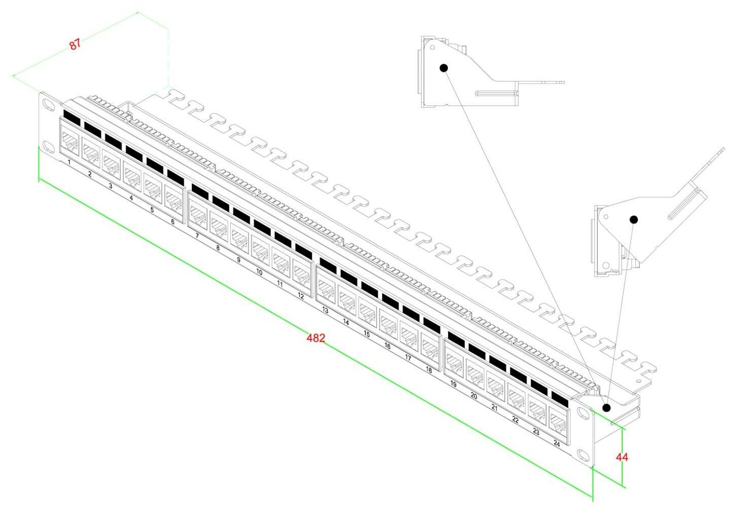 | Особенности | ысокая выступающая часть корпуса IDC-модуля обеспечивает удобство заделки проводников. Для заделки кабеля подходят два типа инструментов: 110 типа и для плинтов (LSA), Задний кабельный организатор для надежной фиксации кабелей, Съемная экранирующая крышка, шина и кабель заземления |