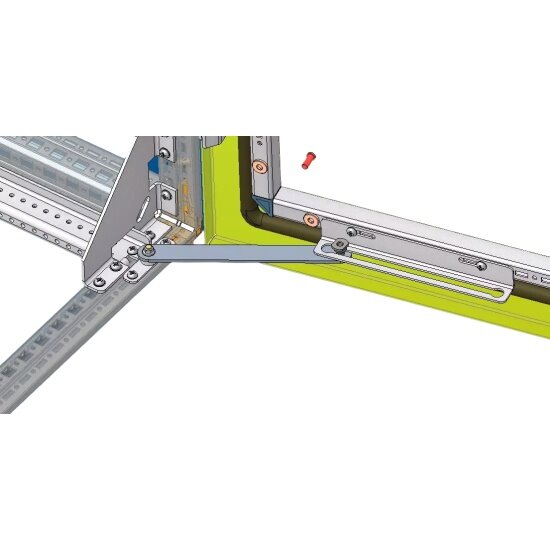 Предназначен для жесткого фиксирования двери в открытом положении, с максимальным углом открытия 120°. Состоит из уголка, жестко фиксирующегося к профилю каркаса. Тяги шарнирно соединенной с уголком. Кронштейна который крепится на раму двери. Тяга с кронштейном соединены с помощью втулки, которая скользит по пазу в кронштейне и фиксируется в крайнем открытом положении двери.