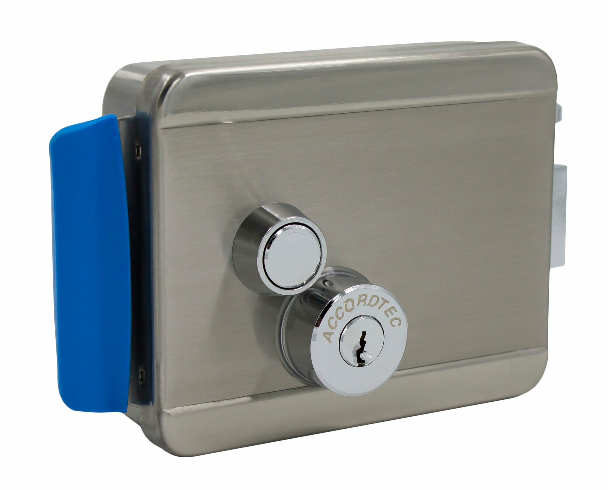 AccordTec представляет собой электромеханический замок, при помощи которого вы сможете надежно запирать двери. Рассматриваемая модель является универсальной. Для использования на других типах дверей необходимо открыть верхнюю крышку, снять со стержня ригеля стопорные кольца, вынуть ригель из замка и повернуть его вокруг оси, установить на место стопорные кольца. Для выхода используется кнопка, расположенная на лицевой части замка. Если вы хотите открывать замок только дистанционно, вы можете заблокировать кнопку.