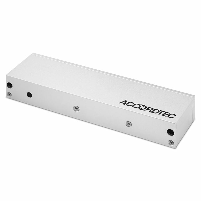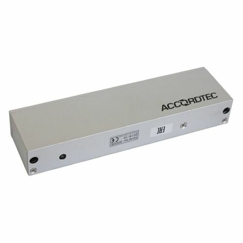 Электромагнитный замок AccordTec предназначен для работы в системе контроля и управления доступом в качестве исполнительного устройства. При офисном дизайне в замок заложен магнит с силой удержания 500 кг. Поверхность оцинкована, диапазон рабочих температур — - 20 °С… 50 °С.Доступно использование разных источников питания, причем при DC 12 В, БП должен быть рассчитан на нагрузку ≥ 0.5 А, а при DC 24 В — ≥ 0.25 А. Максимальное потребление — 420 мA. Тип установки — накладной (магнит — на дверной проем, якорь — на дверь). В комплекте планка для крепления. Габариты — 266×67×39 мм, вес — 4.5 кг.