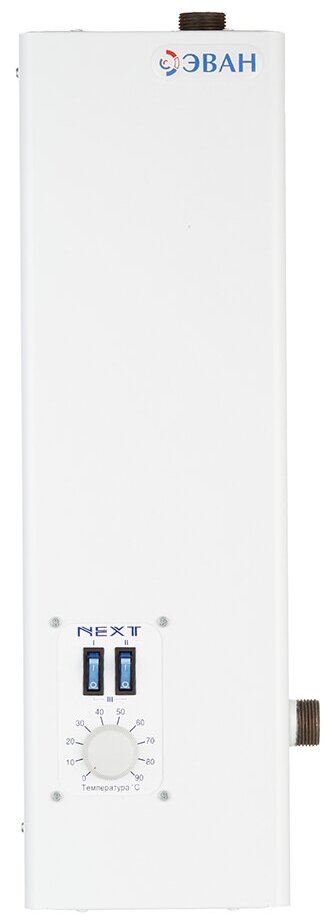 Котел Эван Next 12909 представляет собой моноблок, объединяющий котел и пульт управления в едином корпусе. Требуемая температура теплоносителя в котле устанавливается встроенным термостатом путем плавной регулировки от 30 до 85 градусов. Трехступенчатое управление мощностью котла. Для обеспечения безопасности при нагреве до заданной температуры теплоносителя терморегулятор отключает котел и включает его снова после снижения температуры ниже заданной. Для дополнительной защиты от перегрева приборы оснащены самовозвратным аварийным термовыключателем, который, в случае выхода из строя основного терморегулятора отключает котел при достижении теплоносителем температуры 92 градуса. ТЭНы котла ЭВАН NEXT, как и всех без исключения электрокотлов ЭВАН, сделаны из нержавеющей стали, что повышает срок их службы. Кроме того, в котлах ЭВАН NEXT реализована блочная конструкция ТЭН на резьбовом соединении, что позволяет существенно упростить его замену. Для работы в системах с принудительной циркуляцией электроотопительный котел ЭВАН NEXT имеет колодку для подключения циркуляционного насоса.