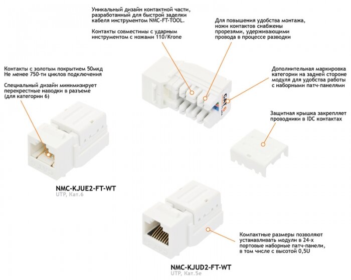 Модуль-вставка типа Keystone NIKOMAX неэкранированный, белый устанавливается в настенные розетки, суппорты настенных коробов и наборные патч-панели. Обеспечивает организацию подключения рабочих станций к информационной сети. Разработан специально для использования с инструментом NMC-FT-TOOL - заделка в одно нажатие. IDC контакты модуля серии FT также совместимы с обычным ударным инструментом с ножом 110 типа или KRONE. Ширина изделия составляет 17 мм, высота - стандартная. Такое исполнение позволяет устанавливать данное изделие в любые наборные патч-панели, в том числе с высотой 0,5U. Устройство выполнено в корпусе из высокопрочного пластика, является идеальным решением для построения неэкранированных систем.