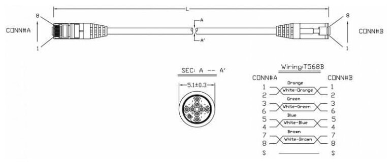 Производится на основе витопарного кабеля, состоящего из многожильных медных проводников 26 AWG (0,48мм) в изоляции из полиэтилена, защищенных внешней оболочкой из малодымного безгалогенного компаунда (LSZH). Разводка проводников в разъемах патч-корда соответствует стандартной схеме T568B.