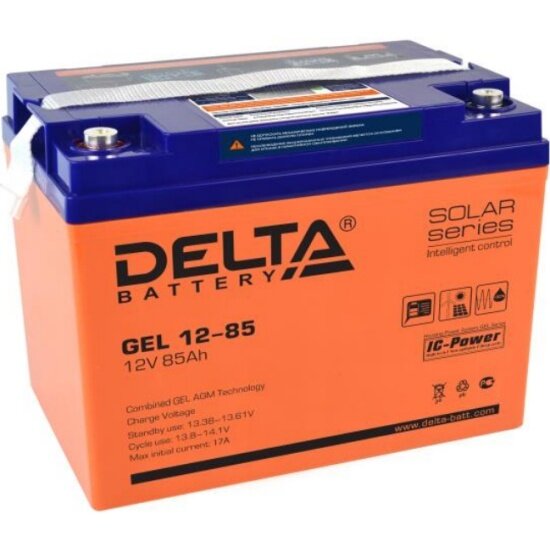 Свинцово-кислотный аккумулятор Delta напряжением 12В и емкостью 85Ач изготовлен по технологии AGM+GEL: combined AGM and GEL technology (частичное сгущение электролита). Устойчив к глубоким разрядам. Дополнительно аккумулятор оснащен LCD дисплеем, отображающем различные статусы работы аккумулятора. Корпус изготовлен из негорючего ABS пластика. Срок службы аккумулятора достигает 10-12 лет. Аккумулятор предназначен для работы в режиме постоянного подзаряда (буферный режим) или в режиме разряд-заряд (циклический режим). Обладает низким внутренним сопротивлением и саморазрядом.