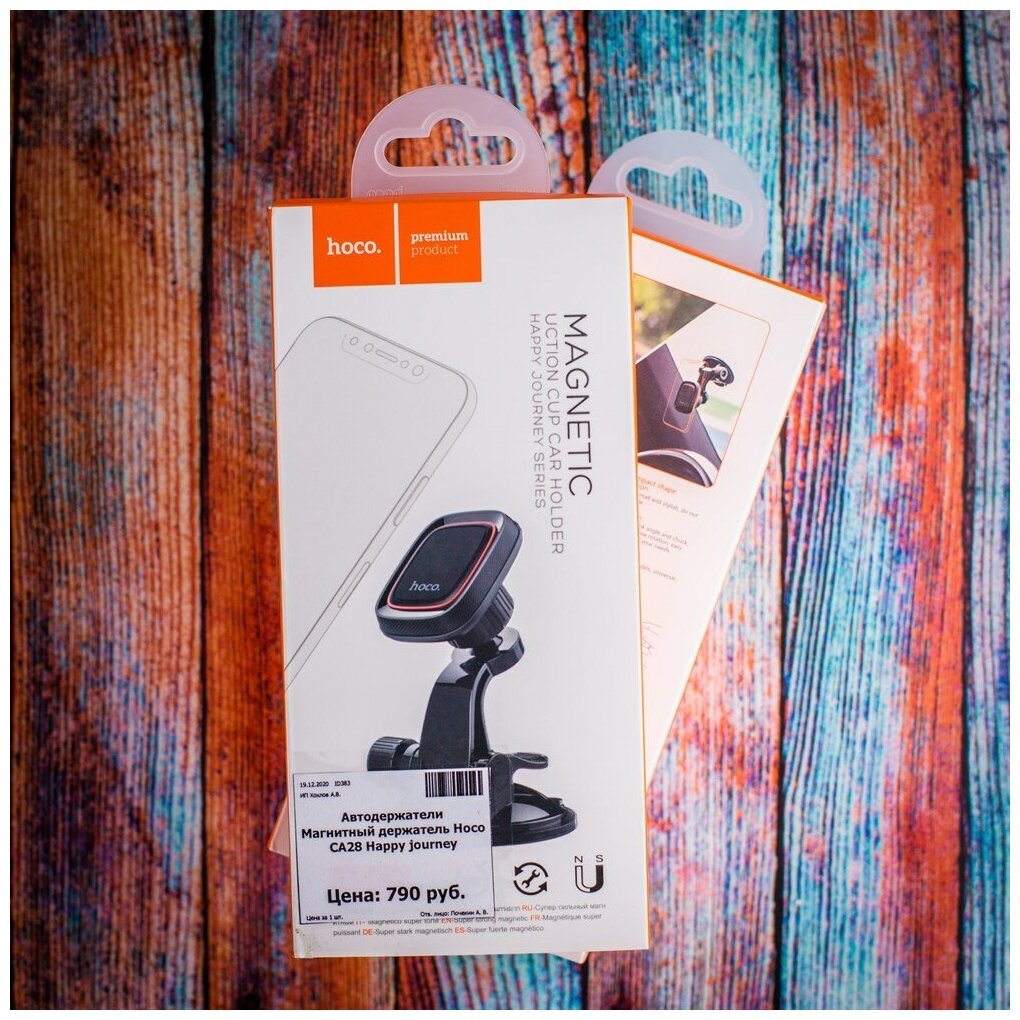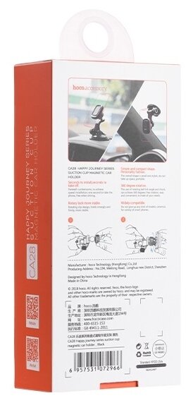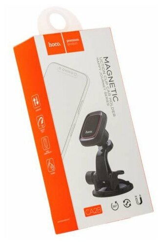 Автодержатель Hoco - удобный аксессуар, крепление которого осуществляется с помощью магнитного фиксатора. Шарнирное крепление позволяет регулировать положение телефона вокруг своей оси. Конструкция устройства обеспечивает свободный доступ к разъёму питания устройства. Держатель имеет приятное на ощупь прорезиненное покрытие. Фиксация телефона на держателе осуществляется посредством металлической пластины на обратной стороне задней крышки телефона или под чехлом. Крепление держателя осуществляется вакуумной присоской к торпедо или лобовому стеклу авто. В комплект входит дополнительное основание с клейкой основой и 3 металлические пластины.