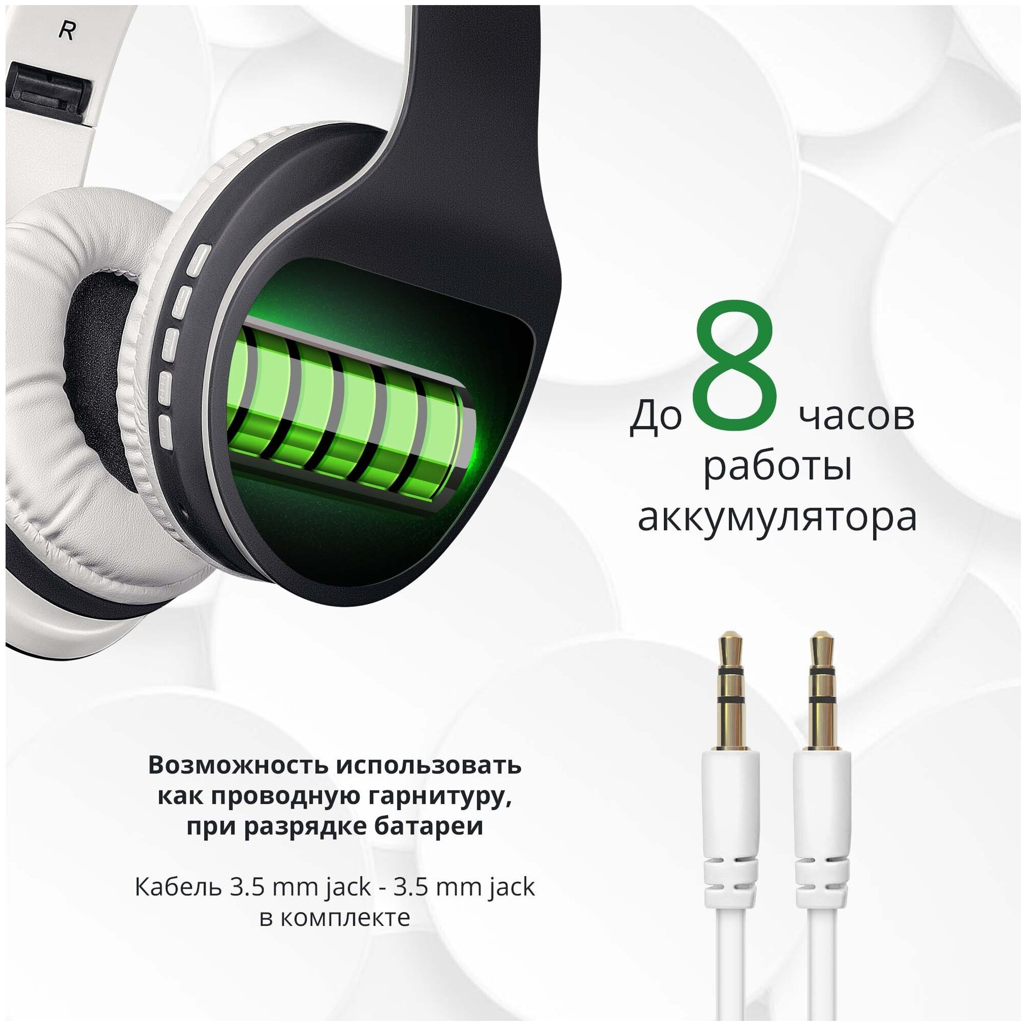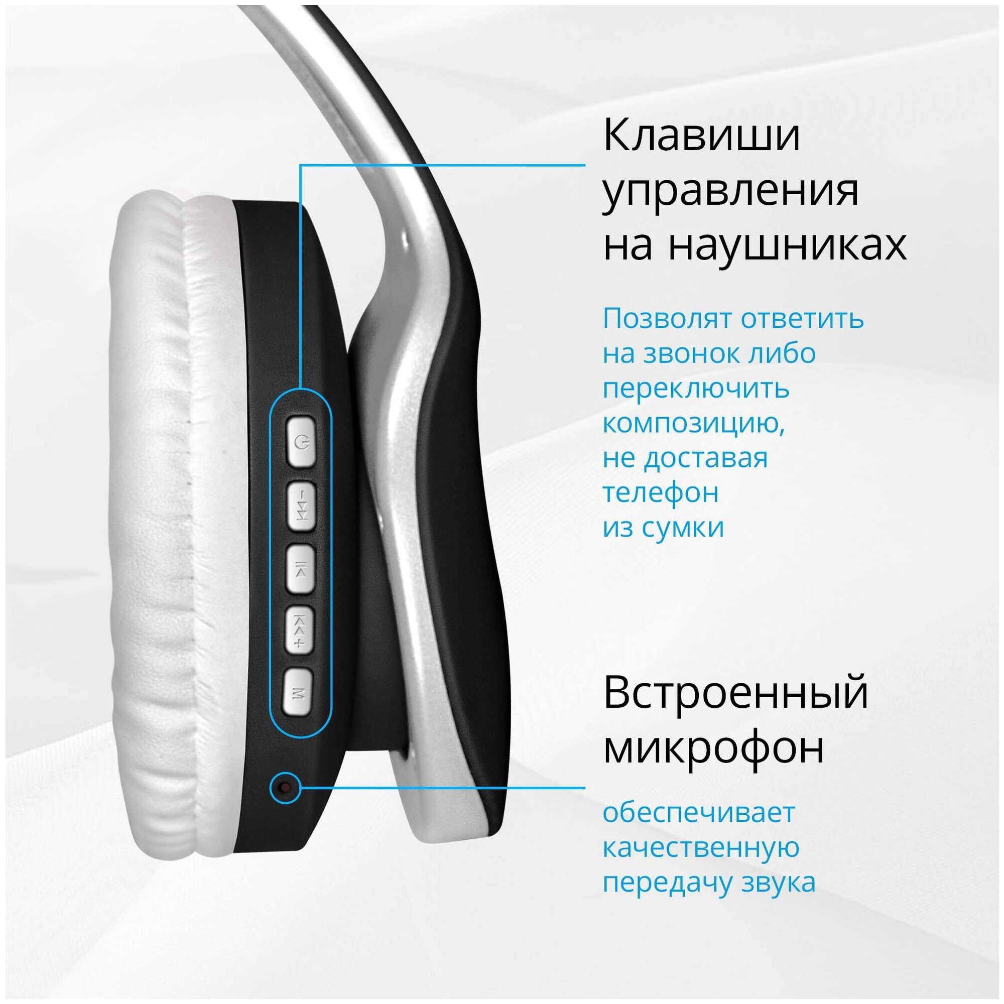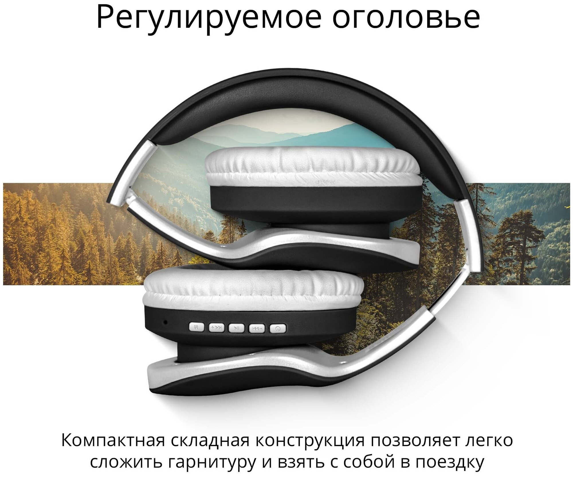 | Прочие особенности и свойства | Беспроводная Bluetooth-гарнитура, Компактная складная конструкция позволяет легко сложить гарнитуру и взять с собой в поездку., , Встроенный микрофон, Встроенный микрофон обеспечивает качественную передачу звука., , Слот для карты MicroSD, Слот для карты памяти стандарта Micro-SD превращает наушники в MP3-плеер - слушайте музыку, не подключаясь к смартфону или ноутбуку., , Встроенный FM-приемник, , Клавиши управления на наушниках, Позволят ответить на звонок либо переключить композицию, не доставая телефон из сумки., , Радиус действия - 10 м, Гарнитура позволяет общаться по телефону или слушать интернет-радио с ноутбука, свободно перемещаясь по комнате., , Аудиокабель в комплекте, Если у вашей гарнитуры сел аккумулятор - просто подключите к ней кабель и продолжайте слушать музыку., , Время работы аккумулятора до 8 часов, Если гарнитура разрядится, просто подключите ее к USB-порту., , Регулируемое оголовье, Возможность подобрать наиболее удобную длину дужки., , Компактная складная конструкция |