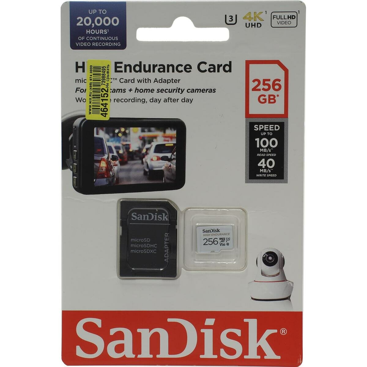 | Дополнительно * | Карта SanDisk® High Endurance microSD™ рассчитана на почти 20 000 часов1 записи. Вы можете быть уверены, что автомобильный регистратор, домашняя система наблюдения или система безопасности не упустит важный видеоматериал, легко выполнит запись и перезапись. Эта надежная карта работает в условиях экстремальной жары и сильного холода, отличается ударопрочностью, водонепроницаемостью и устойчивостью к рентгеновскому излучению2. Классы скорости 10, U3 и V304 означают, что вы можете записывать видео в формате Full HD или 4K3. Благодаря емкости карты до 256 ГБ6 и скорости чтения до 100 МБ/с5 можно записать, сохранить и быстро передать больше видеоматериалов. |