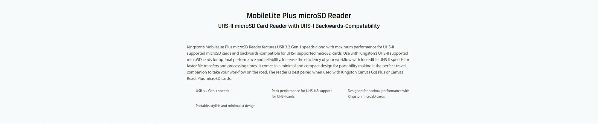 | Дополнительно * | Устройство чтения карт памяти MicroSD MobileLite Plus от Kingston со скоростью чтения USB 3.2 Gen 1, а также максимальной производительностью для карт microSD с поддержкой UHS-II и обратной совместимостью с картами microSD с поддержкой UHS-I. Используйте с картами microSD с поддержкой UHS-II от Kingston для оптимальной производительности и надежности. Повысьте эффективность работы за счет невероятной скорости UHS-II для более быстрой передачи файлов и времени обработки данных. Устройство имеет компактные размеры, что позволяет брать с собой в любую поездку и держать под рукой на работе. Карт-ридер лучше всего работает с картами памяти Kingston Canvas Go! Карты памяти microSD Plus или Canvas React Plus. |