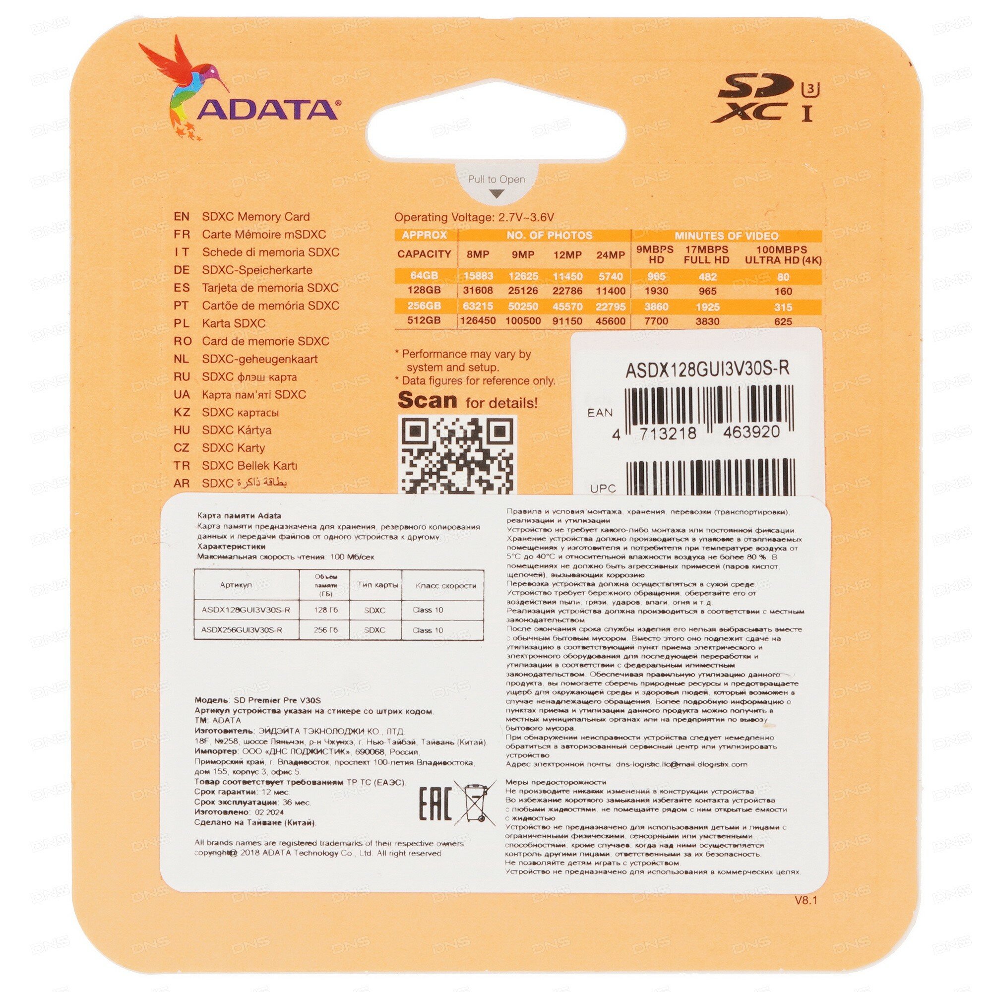 Карта памяти 256GB ADATA Premier Pro SDXC Class 10 UHS-I U3 V30S 95/60 MB/s ASDX256GUI3V30S-R