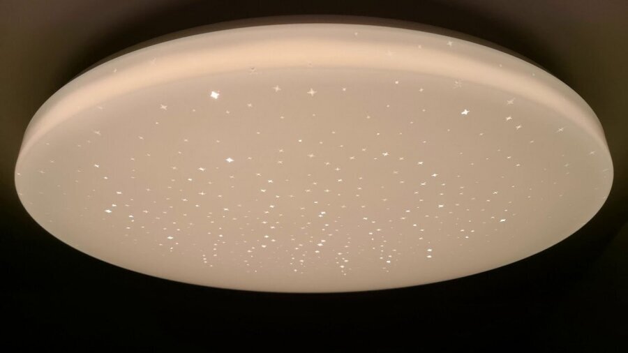 Потолочная светодиодная лампа диаметром 480 мм предназначена для освещения комнат площадью 15-20 квадратных метров. В корпусе толщиной 80 мм расположена умная электроника и светодиоды, способные выдавать световой поток силой 2000 Люмен. При этом цветовая температура может варьироваться от 2700 до 6000 К – от лунного до солнечного света.