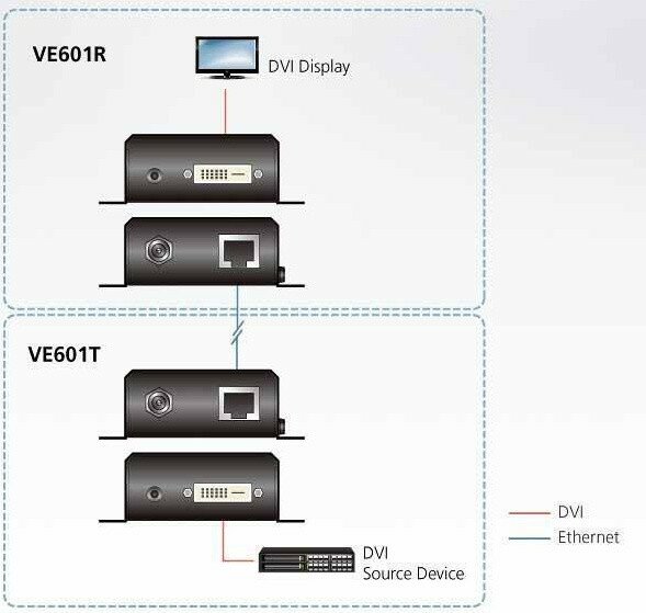 Комплект — DVI-видеоудлинитель с передачей сигнала по технологии HDBaseT-Lite (HDBaseT Class B).DVI видео удлинитель VE601 простое, адаптируемое и экономичное решение для любых применений профессионального аудио и видео с поддержкой 4К. При необходимости, удлинитель может использоваться в решениях требующих защиты видеосигнала от помех, например, на медицинских и военных объектах.Видеоудлинитель состоит из двух модулей передатчика (transmitter) ATEN VE601T и приемника (receiver) ATEN VE601R.