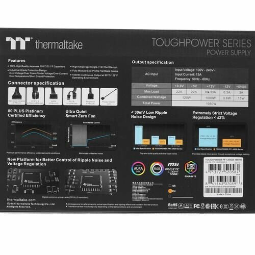 На сегодняшний день товар «Блок питания Thermaltake PS-TPD-1050F3FAPE-1 1050W active PFC fully modular 80 Plus Platinum 140mm fan RTL Toughpower PF1 ARGB» можно купить с кешбеком в 1 магазине: Яндекс.Маркет