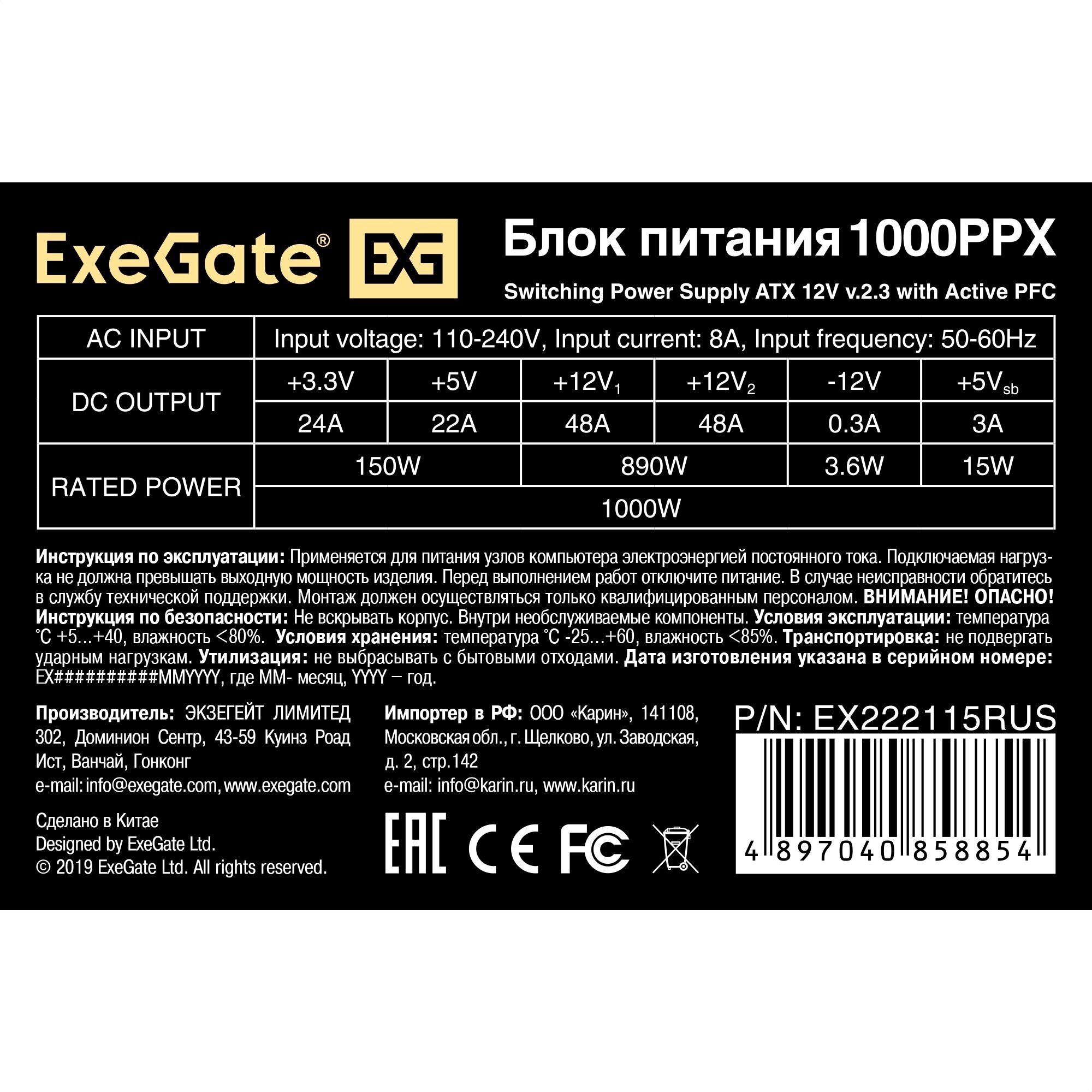 | Прочие особенности и свойства | Блок питания ExeGate PPX предназначен для электропитания компьютерных систем. Благодаря длине силового кабеля устройство подходит для использования в корпусах с нижним расположением БП. Модель собрана из компонентов высокого качества и отличаются стабильной и надежной работой. |