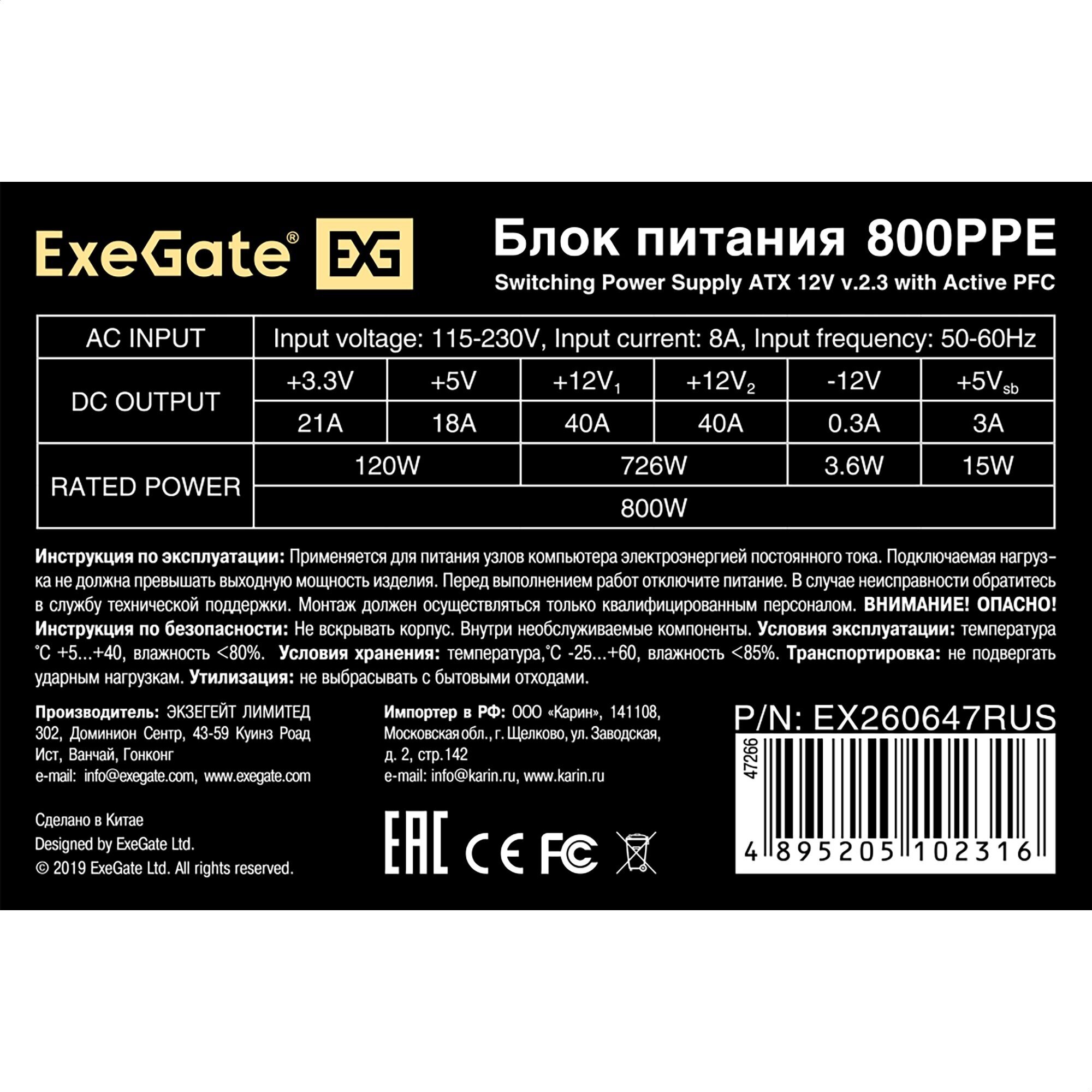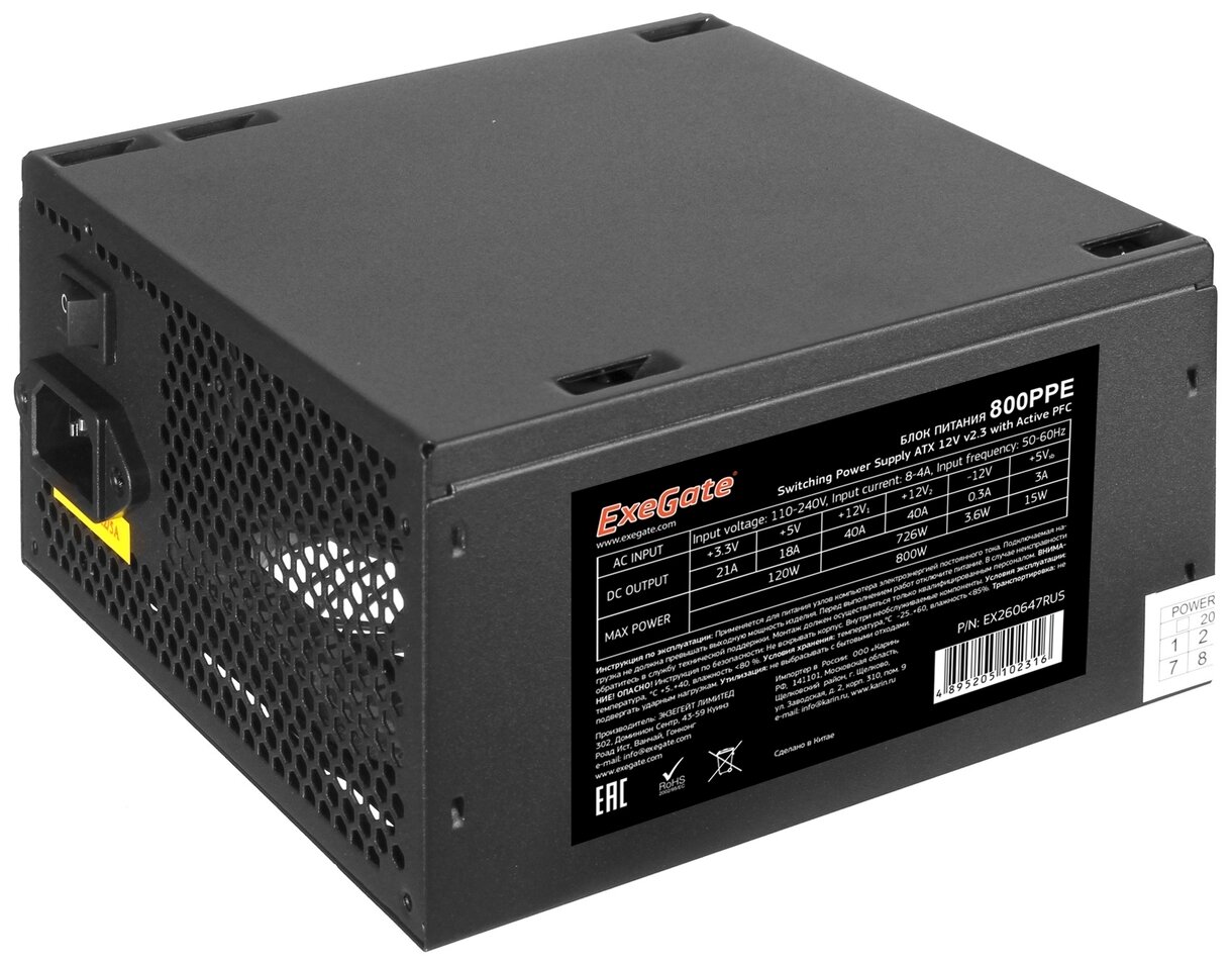 Блок питания ATX Exegate EX260647RUS-S 800W SC black APFC 12cm 24p+(4+4)p PCI-E 3*IDE 5*SATA FDD + кабель 220V с защитой от выдергиван 800PPE
