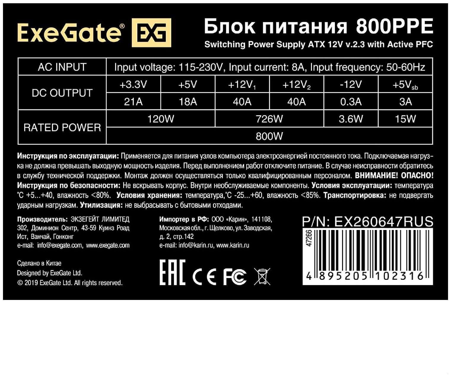 На сегодняшний день товар «Блок питания ATX Exegate EX260647RUS-S 800W SC black APFC 12cm 24p+(4+4)p PCI-E 3*IDE 5*SATA FDD + кабель 220V с защитой от выдергиван 800PPE» можно купить с кешбеком в 2 магазинах: xcom-shop, Onliner BY
