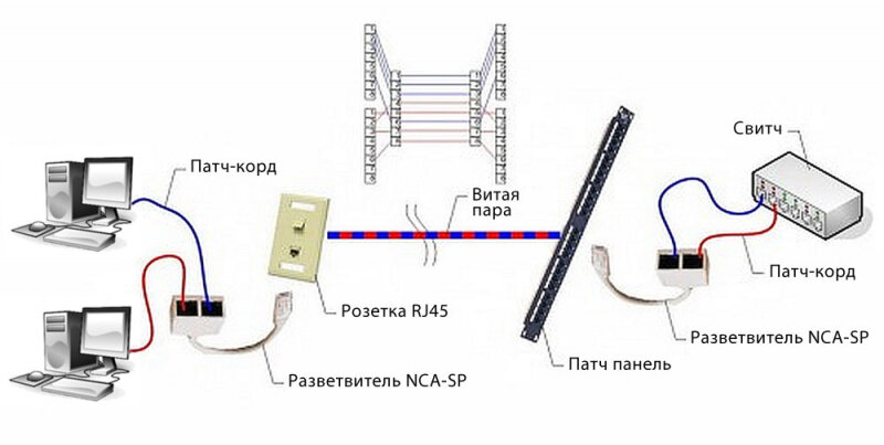 Сплиттер (разветвитель) Y-типа выполнен в виде патч-корда, с одной стороны которого имеется один разъем RJ-45, а с другой стороны – две входные розетки RJ-45, размещенные в пластиковом корпусе. Данные разветвители удобны для разделения портов от розеток на рабочих местах.