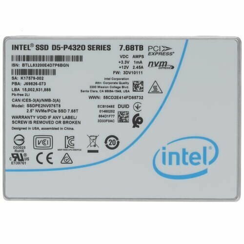 Накопитель SSD 2.5'' Intel D5-P4320 7.68TB PCIe NVMe 3.1 x4 3D NAND QLC 3200/1000MB/s IOPS 427K/36K MTBF 2M SSDPE2NV076T801
