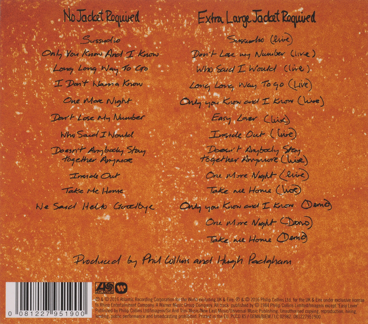 Изначально выпущенный в 1985 году, альбом «No Jacket Required» взлетел на первые места хит-парадов США, Великобритании и многих других стран, получил три премии «Грэмми» («Лучший альбом», «Лучшее поп-исполнение с вокалом», «Продюсер года» (Коллинз получил эту награду с Хью Пэдхэмом)). Во всем мире было продано более 20 миллионов копий альбома. Пластинка включала в себя фирменные эмоциональные баллады Коллинза и треки, на появление которых оказали влияние музыкальные стили фанк и R’n’B. Такие хиты, как «Sussudio», «One More Night», «Don’t Lose My Number» и «Take Me Home», на долгие годы стали одними из основных концертных номеров в шоу Коллинза.