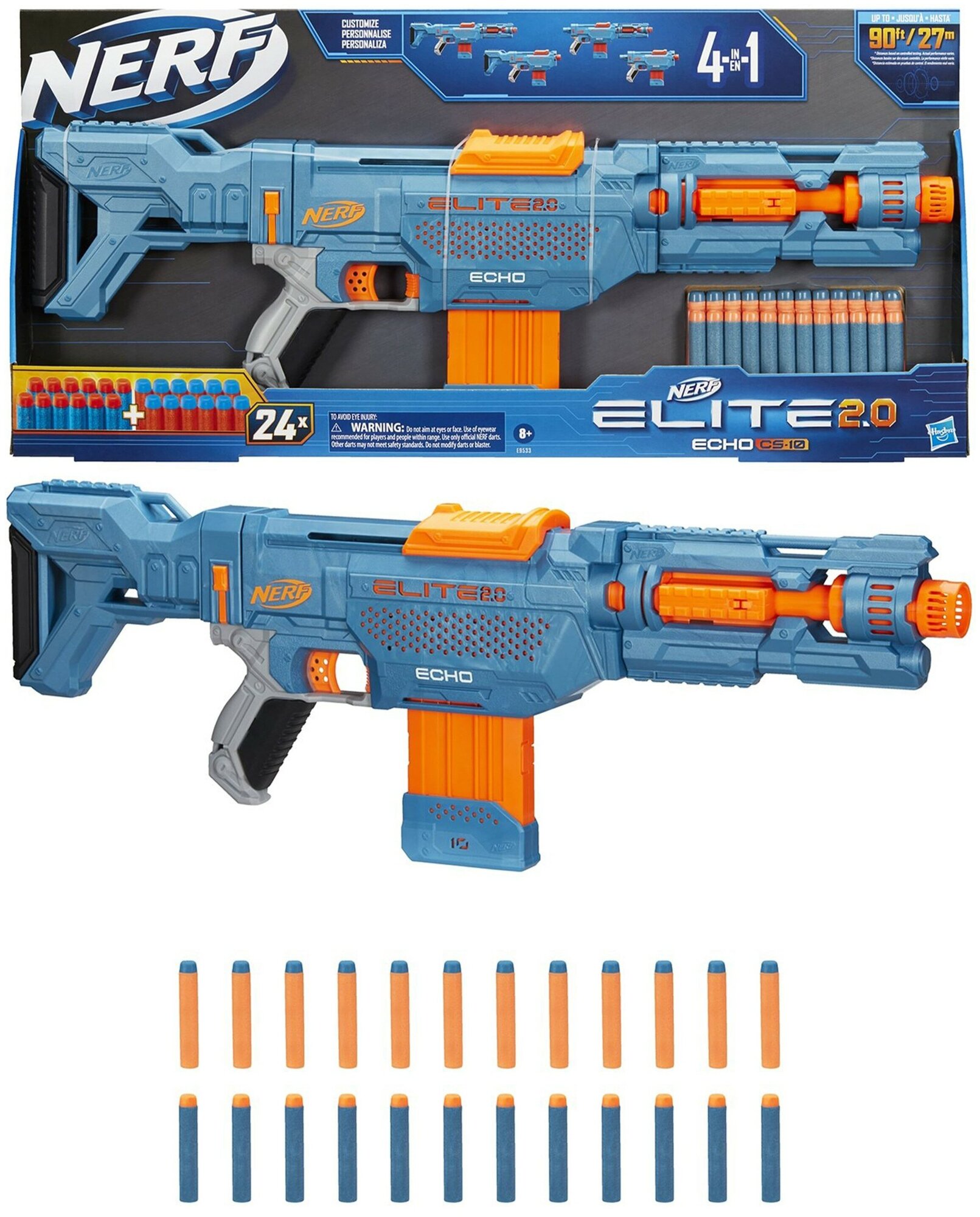 Вооружитесь бластерами Nerf Elite 2.0 и подготовьтесь к бою: бластеры оснащены встроенными элементами индивидуальной настройки, которые позволяют улучшать оружие и получать преимущество в соревнованиях Nerf. Создайте арсенал бластеров Elite 2.0, чтобы оптимизировать стратегию игры и использовать особые тактические приемы и гибкие возможности в каждой миссии или битве! К бластеру Nerf Elite 2.0 Echo CS-10 прилагаются съемный приклад и съемный удлинитель ствола, благодаря которым бластер можно различными способами адаптировать к игре. В комплекте 1 бластер (со съемным прикладом, удлинителем ствола и обоймой на 10 стрел), 24 стрелы и инструкция Характеристики продукта Подготовьте бластер к любой битве или миссии с помощью съемного приклада, съемного удлинителя ствола и 4 тактических планок К бластеру прилагаются 24 оригинальные стрелы Nerf для полной зарядки обоймы на 10 стрел, еще 14 стрел остаются в запасе для перезарядки Чтобы выпустить 1 стрелу, передвиньте ползунок для приведения в готовность к себе и от себя и нажмите на спусковой крючок. Чтобы выпустить все 10 стрел в виде очереди, зажмите спусковой крючок и несколько раз передвиньте ползунок Держите дистанцию: бластер выпускает стрелы на расстояние до 27 метров Подробнее Для детей от 8 лет Не цельтесь в глаза и лицо Используйте только оригинальные стрелы Nerf Не вносите изменения в конструкцию стрел или бластера