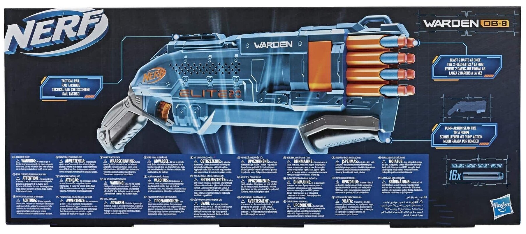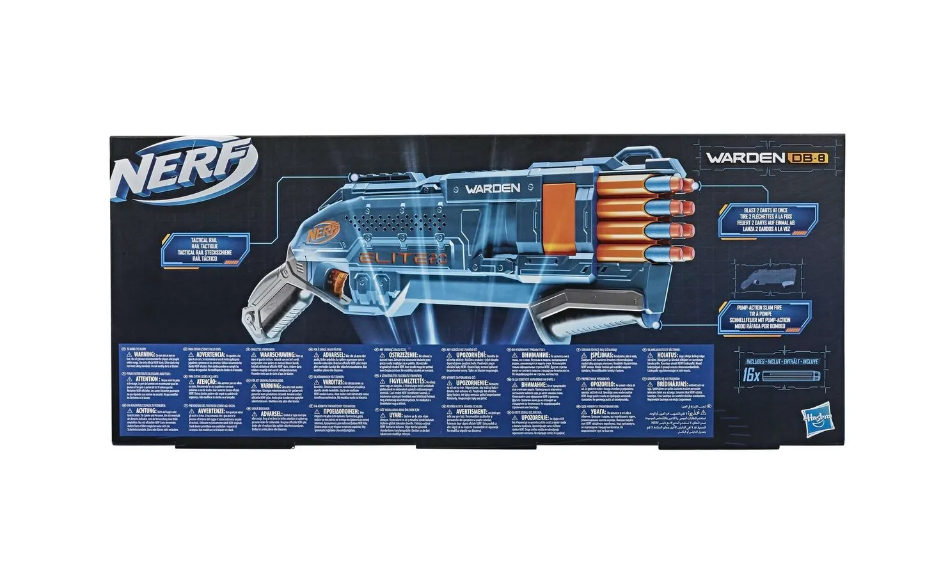 Бластер Nerf Elite 2.0 Warden DB-8 со встроенными элементами индивидуальной настройки для улучшения орудия и преимущества в соревнованиях, выпускает по 2 стрелы одновременно или очередью из 8 стрел. К бластеру прилагаются оригинальные стрелы. Орудие рассчитано на 8 стрел, есть отсек для хранения еще 8 стрел. Для боевой готовности необходимо передвинуть ползунок к себе и от себя. Бластер стреляет на расстояние до 26 метров.