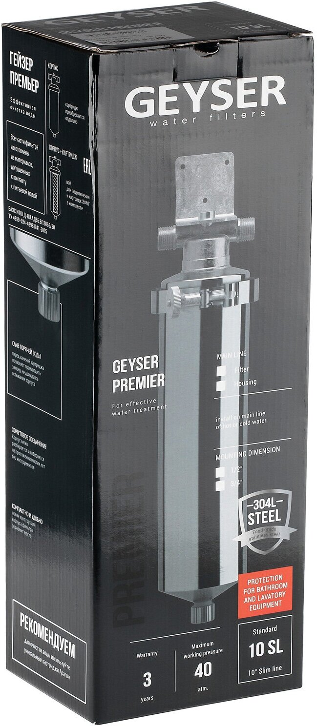 Гейзер-Премьер 10SL 3/4" устанавливается на вход в систему горячего или холодного водоснабжения. Корпус фильтра изготовлен из высококачественной нержавеющей стали марки 304L, устойчивой к возникновению коррозии, что гарантирует высокую надежность и многолетнюю работу фильтра.