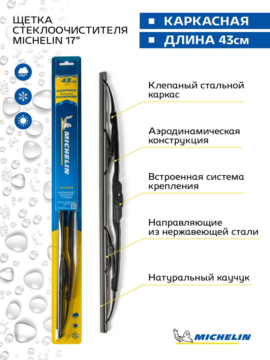 | Наименование модели | Щетка стеклоочистителя каркасная MICHELIN 17" (43 см), 13917 |