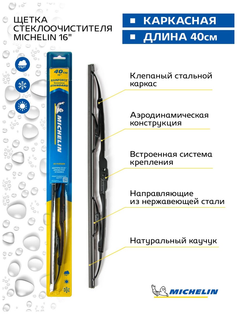 | Наименование модели | Щетка стеклоочистителя каркасная MICHELIN 16" (40 см), 13916 |