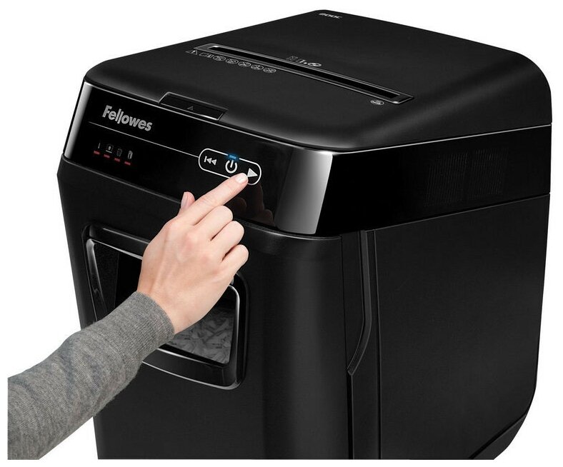 Новый офисный шредер с автоподачей Fellowes AutoMax . Функция AccuFeed Technology сводит к минимуму участие пользователя в процессе уничтожения ставшей ненужной документации. Пользователю достаточно только загрузить уничтожаемые документы в удобно расположенный приёмный ящик, задвинуть его и нажать кнопку старт.