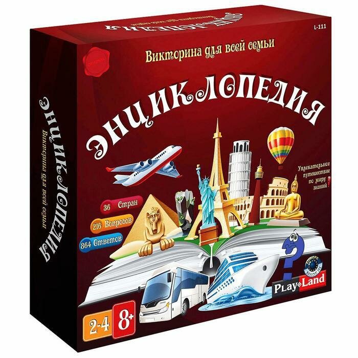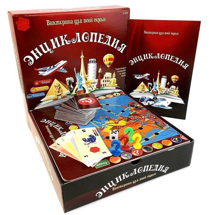 О игре: Путешествуя по игровому полю, игроки попадают в самые разные уголки планеты, отвечают на вопросы и зарабатывают деньги. Для передвижения по карте мира игроки используют виртуальные маршруты: морской, сухопутный и воздушный. А такое путешествие хоть и виртуальное, но стоит денег. Перед каждым путешествием игрокам нужно выбрать пункт отправления и построить маршрут до нужной страны. В процессе игры участники виртуально побывают в разных частях света, посетят 36 стран и ознакомятся с их культурой и историей. Тщательно подобранные вопросы и детально разработанная механика делают процесс игры максимально завлекательным и интригующим! Перед участниками игры открывается целая энциклопедия исторических и географических знаний! Это игра отлично подходит как детям, так и взрослым. Исторические тайны, открытия ученных и удивительные географические факты… Все это будет ждать вас в настольной игре Энциклопедия!