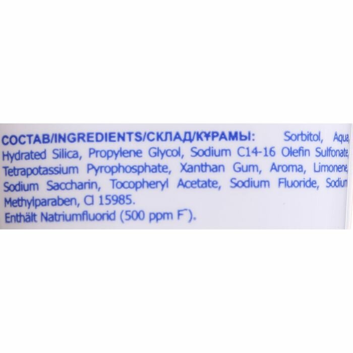 | Состав | Sorbitol, Aqua, Hydrated Silica, Propylene Glycol, Sodium C14-16 Olefin Sulfonate, Tetrapotassium Pyrophosphate, Xanthan Gum, Aroma, Limonene, Sodium Saccharin, Tocopheryl Acetate, Sodium Fluoride, Sodium Methylparaben, Cl 15985 |