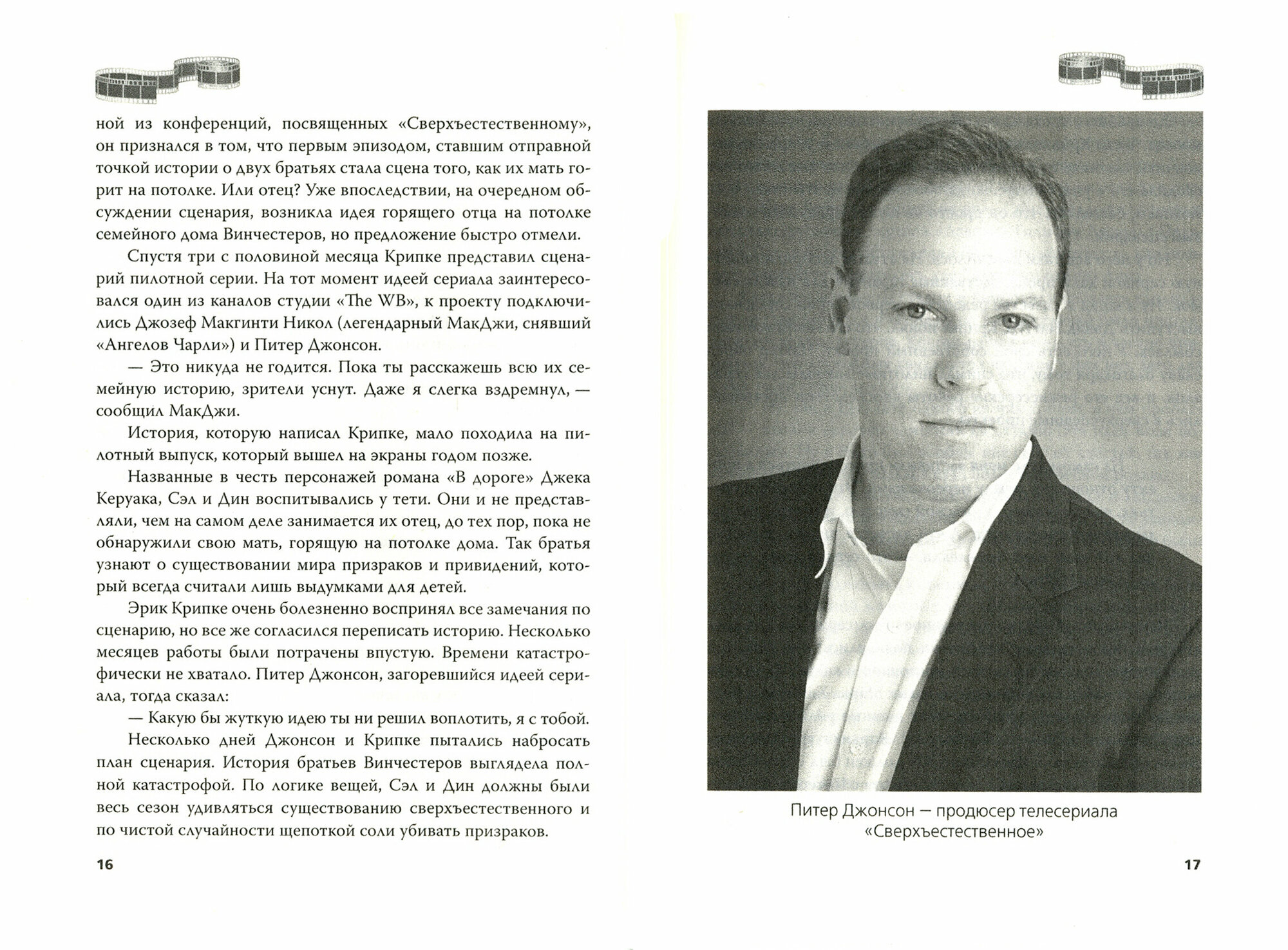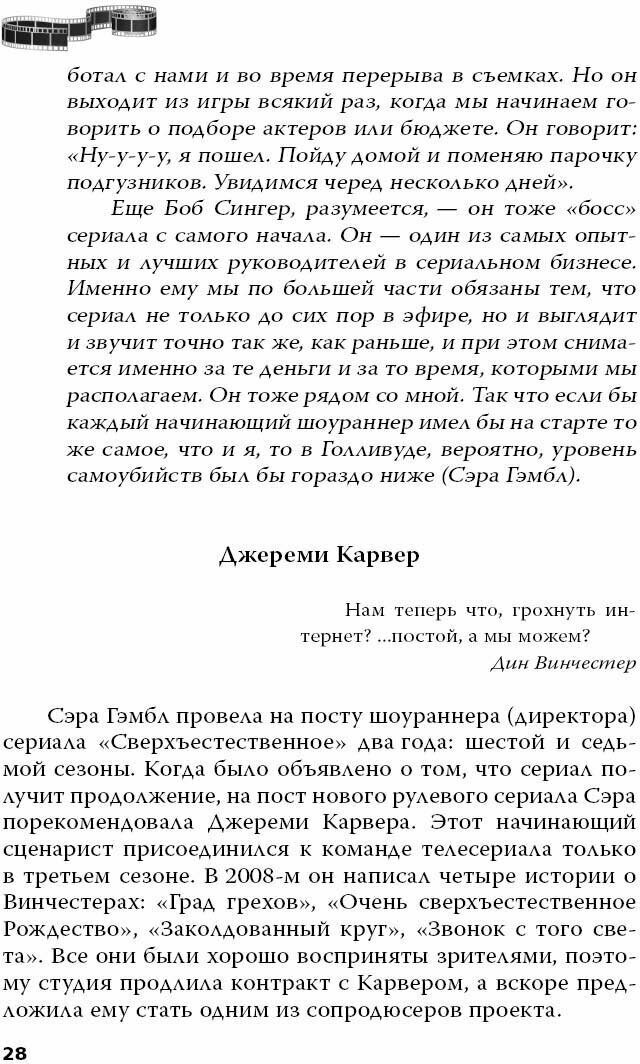 Chevrolet Impala 1967-го года выпуска и ехали по бесконечным дорогам Америки. Машина и придорожные закусочные стали для них настоящим домом. Для создателей сериала Эрика Крипке и Сары Гэмбл участие в этом проекте стало судьбоносным. Благодаря роли Джона Винчестера голливудский актер Джеффри Дин Морган прославился на весь мир. Главный режиссер первых сезонов Ким Маннерс умер на съемочной площадке. Так или иначе, сериал изменил жизни всех участников съемочного процесса. Как создавалась мифология сериала? Как проходили съемки, и как изменилась жизнь актеров многосерийного фильма? На все эти вопросы вы найдете ответы в новой книге "Сверхъестественное. Подлинная история братьев Винчестеров".