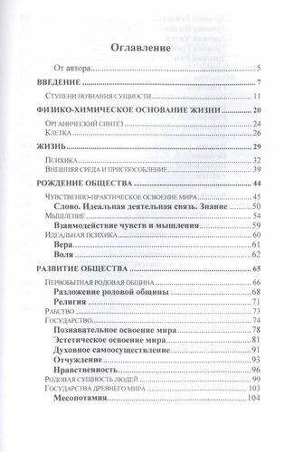 В своей книге автор рассуждает о зарождении и развитии жизни и общества; развитии от материи к духовности. При этом весь процесс изложен как следствие взаимодействий противоборствующих сторон, - начиная с атомов и заканчивая государствами.