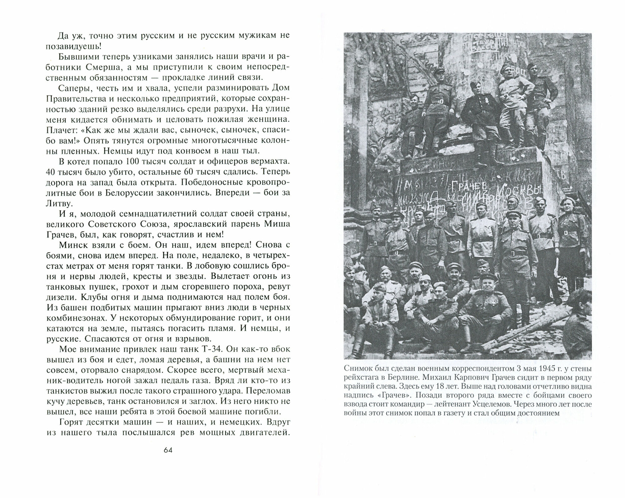 В книге Михаила Карповича Грачева (1926–2018) рассказано о судьбе совсем еще юного парня, в 17 лет призванного в Красную армию и дошедшего до самого берлинского Рейхстага. Несмотря на то что М.К. Грачев был распределен в батальон НКВД правительственной связи, ему неоднократно приходилось вступать в пехотный бой с упорно оборонявшимся врагом. Таковы были реалии стремительного и почти безостановочного наступления Красной армии в последний период войны. В то же время прямые служебные обязанности автора несколько раз сталкивали его с самыми прославленными полководцами. Книга записана со слов М.К. Грачева его сыном Н.М. Грачевым.