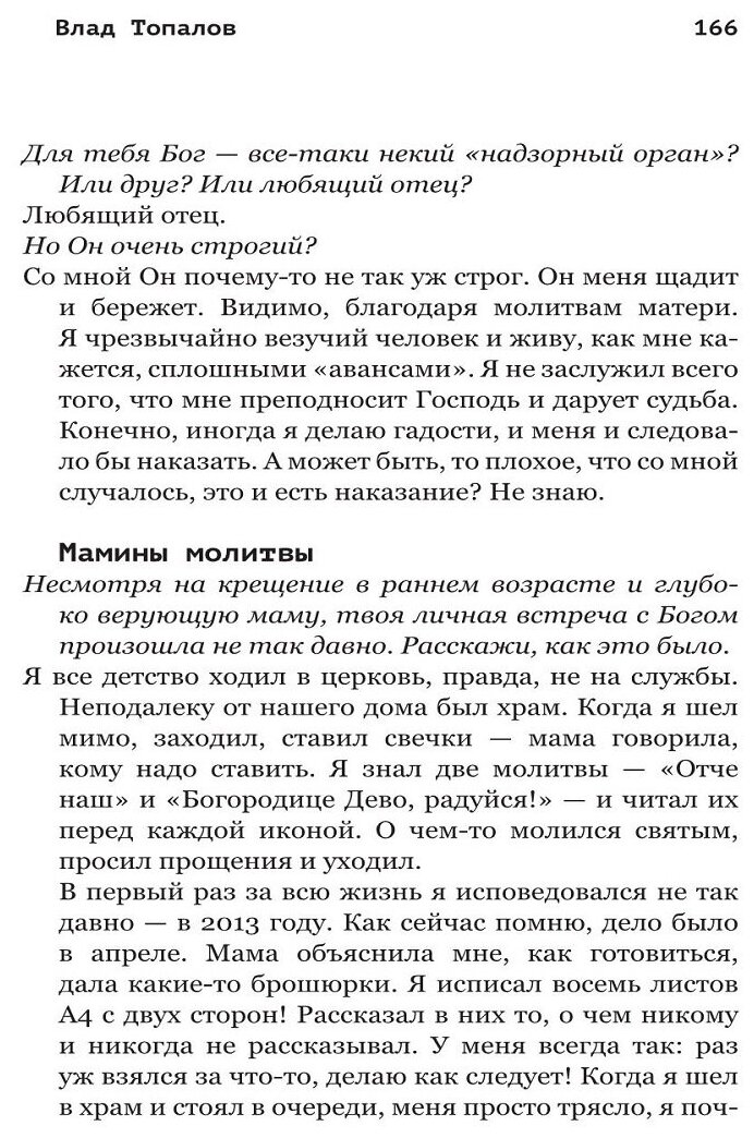 Книга, действительно, достойна внимания. Она выстроена как разговор о вере и жизни с известными и успешными людьми, при этом одна из главных задач книги, как сказано в предисловии - ломка стереотипов о том, какие они, церковные люди. Слабые, психически зависимые и неустойчивые, пассивные, закрытые для мира, зашоренные? Перечень имён в этой книге говорит сам за себя, а разнообразие духовного опыта, о котором здесь рассказывается, даёт много поводов к размышлению и, возможно, к какому-то изменению читателя в лучшую сторону. Книга издана в мягком переплёте, склеена так, что не раскрывается полностью, текст удобен для чтения.