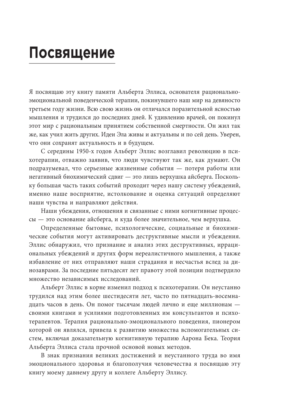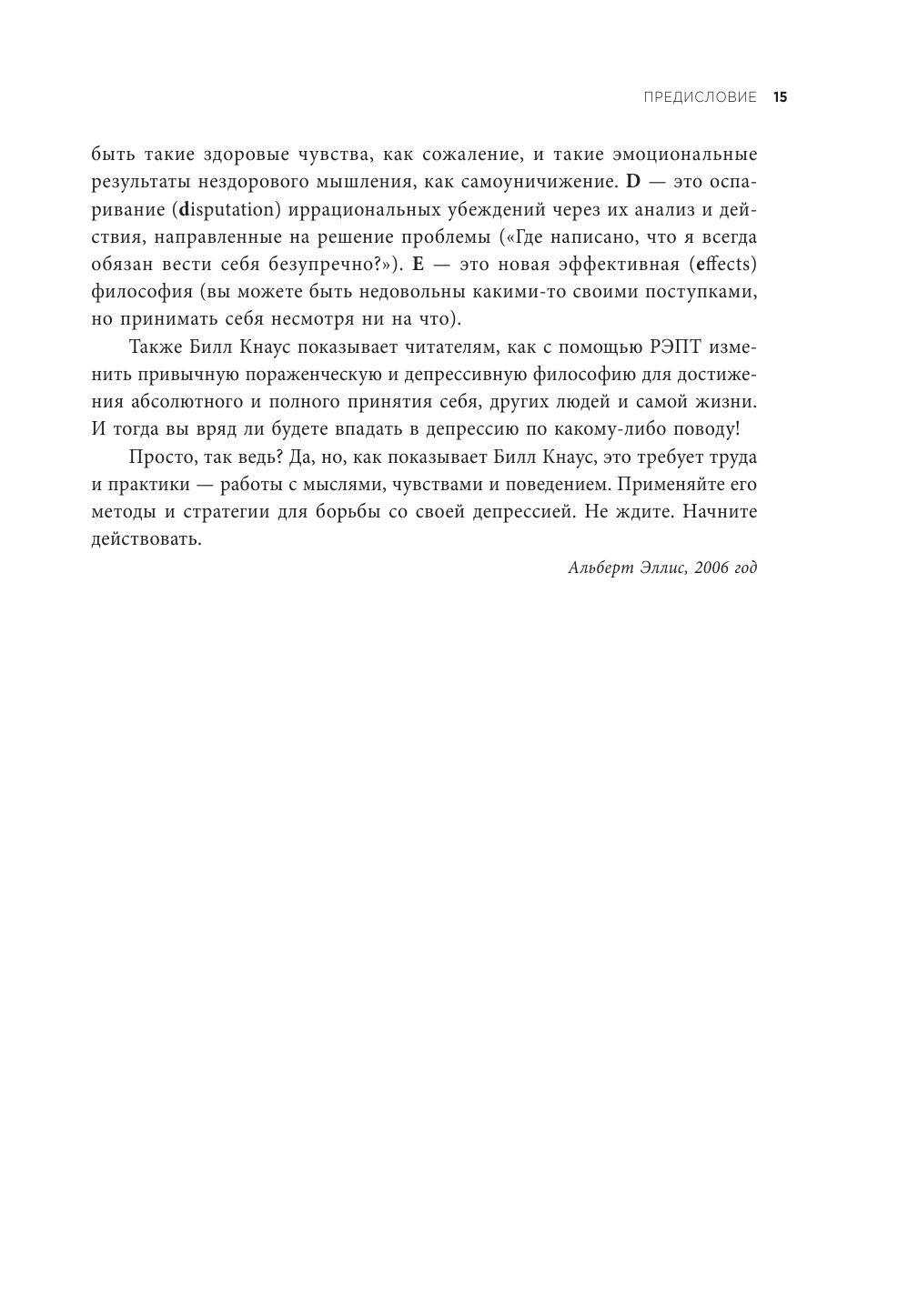 Библиотерапия депрессии однозначно действует, если дело не зашло слишком уж далеко, в чем я убедился на собственном опыте,. Хотя конечно же само чтение не заменит квалифицированного психотерапевта или психолога, Скорее – будет хорошим дополнением к психотерапии в качестве самостоятельного вида лечения. Книгу Уильяма Дж. Кнауса я купил совсем недавно и сразу же начал изучать. Лично меня заинтересовала школа Альфреда Эллиса, на которой в том числе базируется материал данной книги. Давно слышал об Эллисе, как об одном из основателей когнитивно-поведенческой терапии. Теперь, благодаря книге «Депрессия не навсегда. 25 практик для преодоления грусти» появилась возможность познакомиться с ней подробнее. Рекомендую всем интересующимся данной тематикой