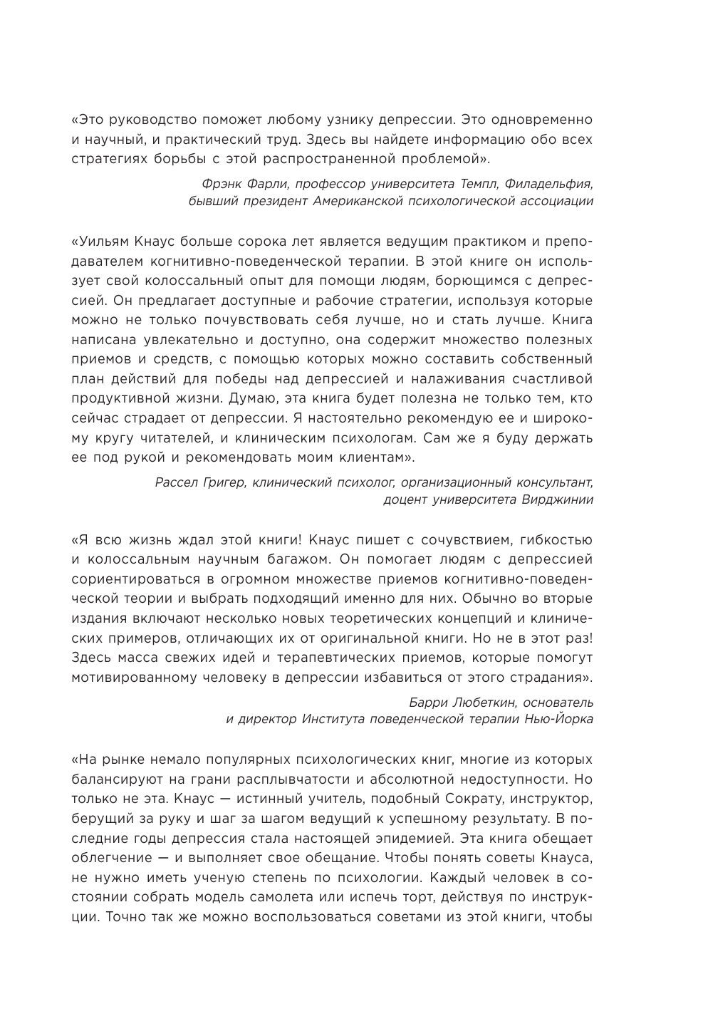 В прошлом месяце я купила «Депрессия не навсегда» (У. Кнауса). Честно говоря, заказывая книгу, я была настроена немного скептически: я ожидала, что книга будет состоять из нескончаемой теории о психологических расстройствах. К счастью, мои ожидания не оправдались! Теория в книге, разумеется, есть, но все изложено настолько понятным, интересным языком, что даже человеку, который ни разу не читал книги по психологии все будет предельно ясно. Меня приятно удивил практический подход автора к решению проблемы читателей. В каждой главе приведен планер, который читателю предстоит самому заполнить, опираясь на методики, изложенные автором ранее. Это превращает книгу из простого источника знаний в реального «карманного психотерапевта». Мне, например, очень помог метод ABCDE, при помощи него я разобралась с постоянным чувством тревожности (раньше это было для меня настоящей проблемой!). Надеюсь, что мой отзыв был вам полезен и, возможно, послужил дополнительным поводом ознакомиться с этой книгой