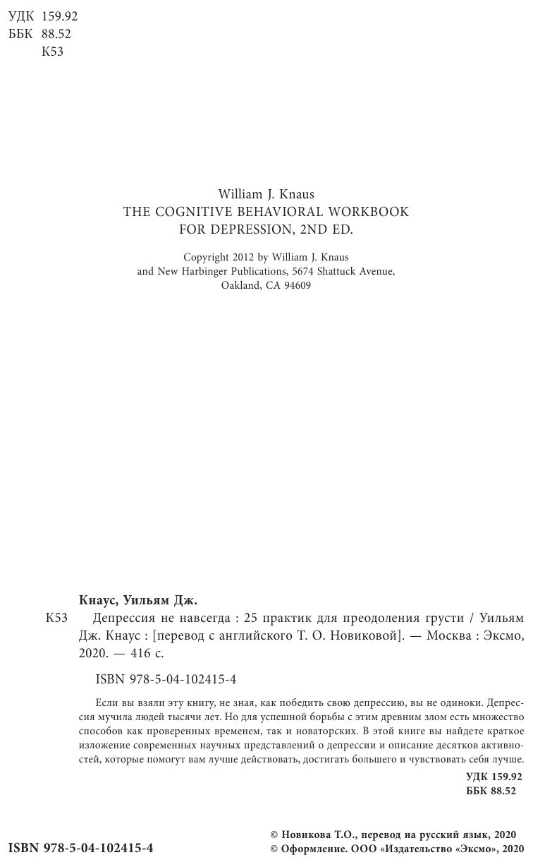 Депрессия не навсегда. 25 практик для преодоления грусти (Кнаус Уильям Дж.); ООО "Издательство "Эксмо", 2020
