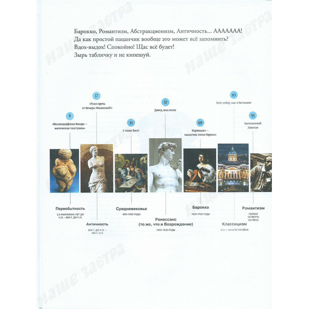 Книга очень легко читается. Хорошо структурирована. Легко обяснит вам в чем "соль" искусства, даже если у вас нет художественного образования. Уникальная и единственная в своем роде с отсылками, пасхалками и пояснениями как продолжают жизнь знаменитые произведения сегодня. Очень советую каждому иметь дома печатное издание. Чтобы, если на кухне вдруг разгорелся спор о Караваджо или Мунке быстро найти всю информацию, и не только!