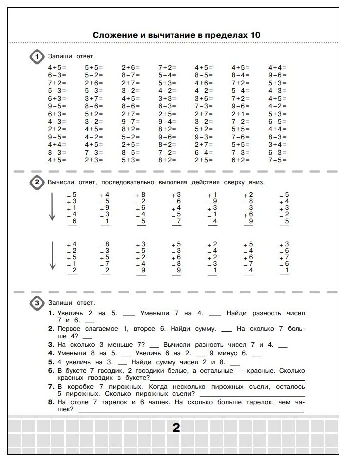 В пособии предложены примеры разного уровня сложности, распределенные по трём блокам. 1-й уровень сложности – это обычные примеры; 2-й уровень сложности – столбики-цепочки, действие в которых выполняются последовательно сверху вниз; 3-й уровень сложности – задания и задачи с хитрой формулировкой, успешное выполнение и решение которых подтвердит прочные знания ученика.