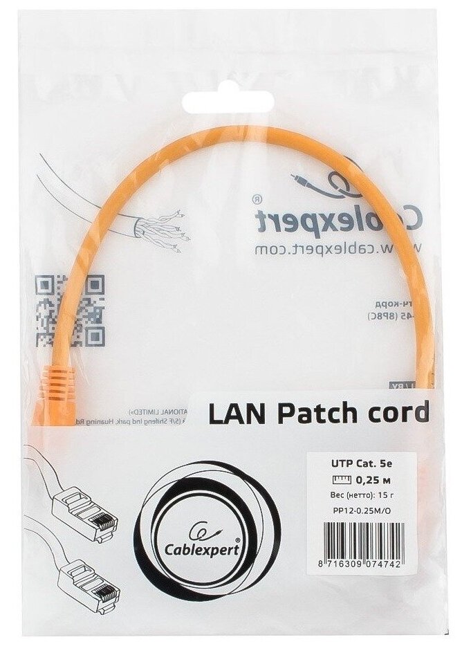 Кабель патч-корд UTP 5e кат. 025м Cablexpert PP12-0.25M/O