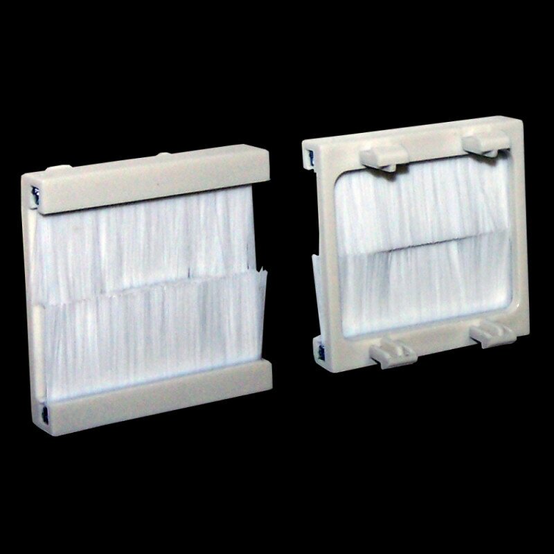 Вставка с щеточным вводом предназначена для вывода из кабельных каналов или межстенового пространства кабелей с нестандартными разъемами. Вставка оборудована двухсторонней щетиной белого цвета для защиты от попадания пыли и посторонних предметов. Вставка имеет размер 45х45 мм под французский стандарт Mosaic и может применяться для комплектации розеток, а также рабочих мест в миниколоннах, напольных лючках и настенных боксах.