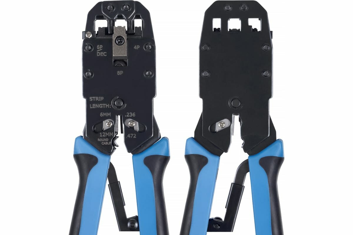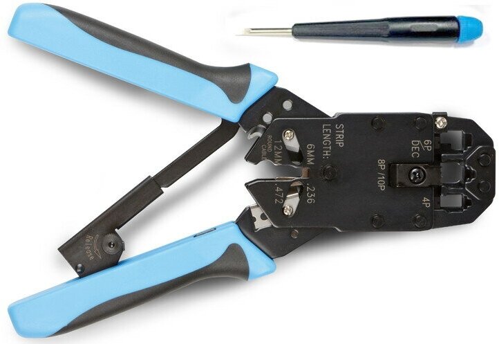 Профессиональный обжимной инструмент служит для выполнения работ по обжиму разъемов RJ-45, RJ-12, RJ-11 (8P8C, 6P6C, 6P4C, 4P4C). Он изготовлен из среднеуглеродистой стали и имеет хромированное покрытие, что обеспечивает высокую износостойкость и увеличивает срок эксплуатации инструмента.
