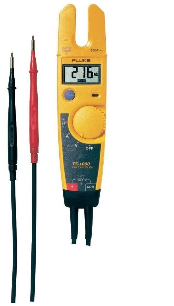 Тестер Fluke T5-1000 предназначается для быстрого определения параметров переменного тока и сопротивления, а также расчета переменного или постоянного уровня напряжения. При помощи данного устройства вы сможете проверить целостность цепи, не подвергая себя опасности. Прибор дополнен небольшим дисплеем для отображения информации, а также звуковой сигнализацией.Устройство Fluke T5-1000 оснащено функцией автоматического выбора диапазона измерений. Комфортной эксплуатации способствует наличие режима памяти, а также функции автоотключения. Для работы прибора требуется наличие двух AA-батареек. Устройство поставляется с щупами и измерительными проводами.
