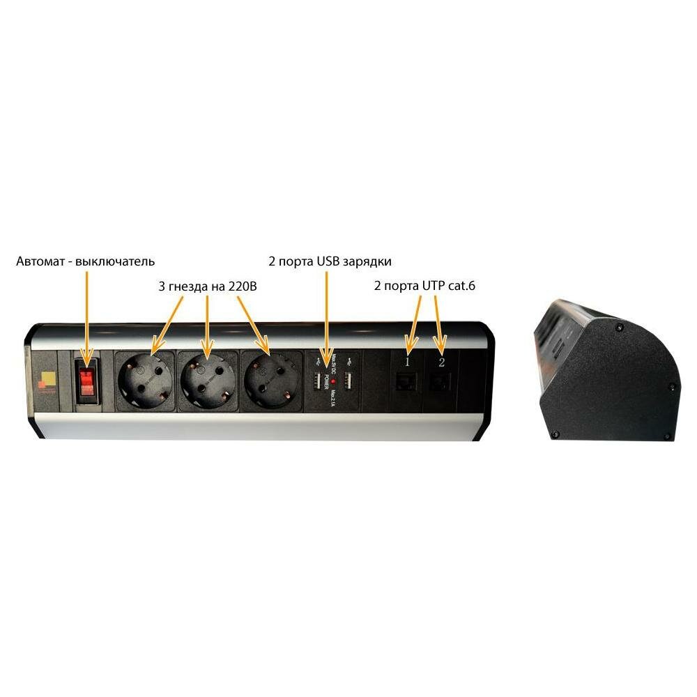 | Прочие особенности и свойства | Настольный мультимедийный блок предназначен для установки непосредственно на рабочем столе пользователя. Изделие устанавливается на столешницу рабочего места при помощи 2х струбцин, входящих в комплект. |