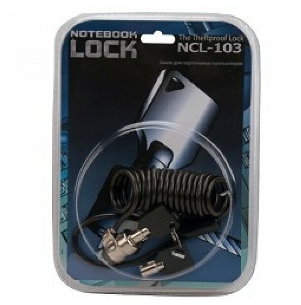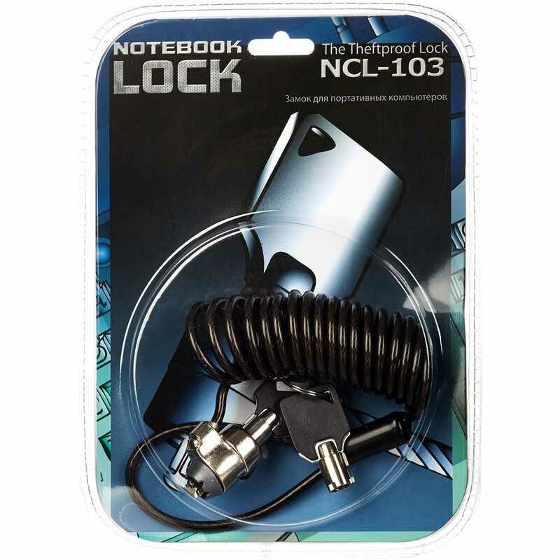 Запирающее кабельное устройство для ноутбука. Необходимо обмотать стальной трос вокруг какого-либо неподвижного предмета например, ножки шкафа и подключить трос к замку. В комплекте два ключа. Устанавливается трос безопасности как правило, в гнездо безопасности ноутбука Kensington lock.